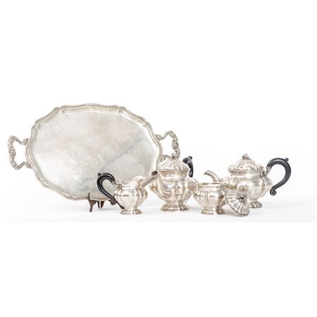 SERVIZIO in argento composto da caffettiera, theiera, lattiera, zuccheriera e vassoio, manici in legno ebanizzato (peso lordo g. 4.794).