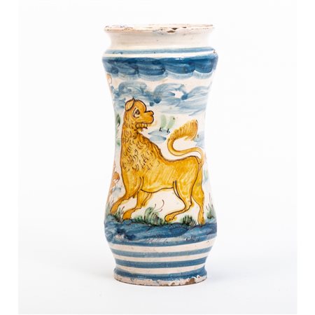 ALBARELLO in ceramica smaltata e decorata raffigurante "Cane" (usure e file').