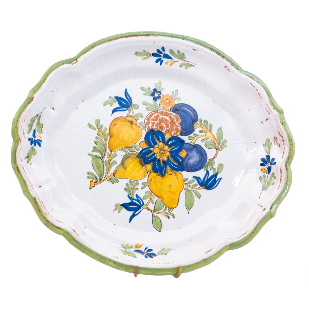 Piatto di forma ovale in maiolica smaltata e decorata a motivo floreale e frutta.