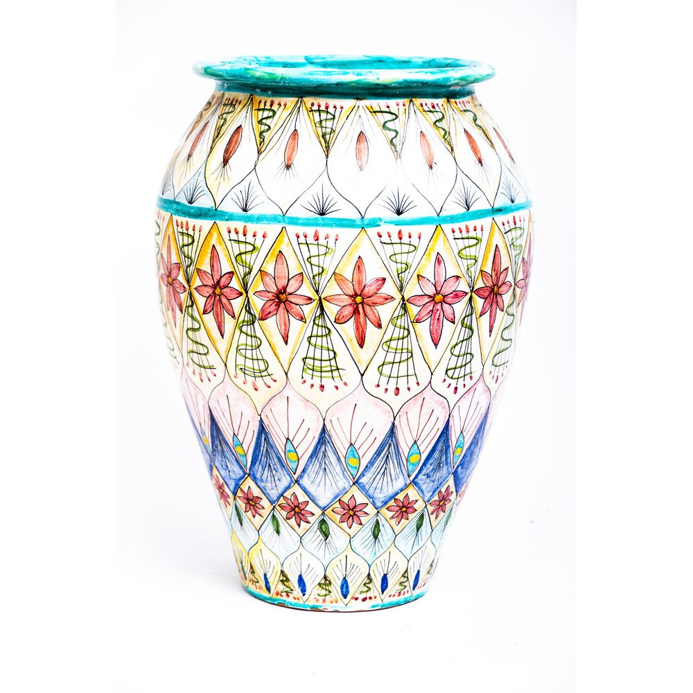 GRANDE VASO in terracotta dipinta e decorata a motivo floreale e fogliaceo.
