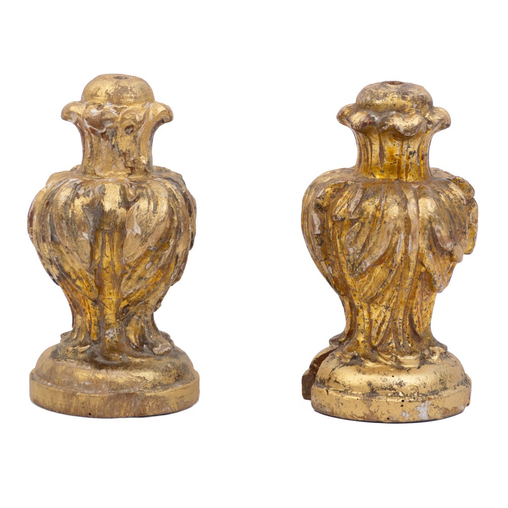 Coppia di pigne in legno intagliato e dorato ad argento a mecca (restauri e mancanze).