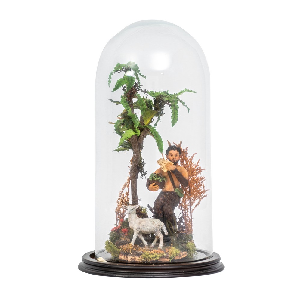 COMPOSIZIONE IN CEROPLASTICA "Satiro con capretta", entro campana in vetro con base in legno.