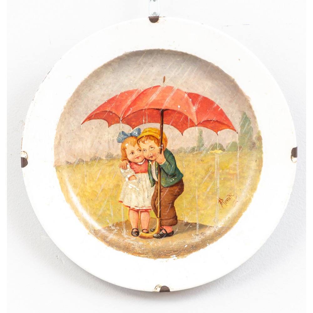 Piatto in ceramica dipinta raffigurante "Bimbi sotto la pioggia", firmato P.Mondi.