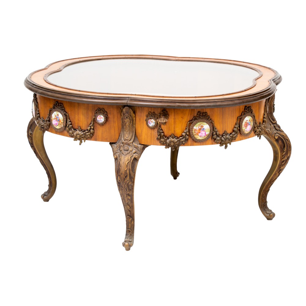 in legno di rosa con piedi e guarniture in bronzo, placche in porcellana dipinta.