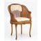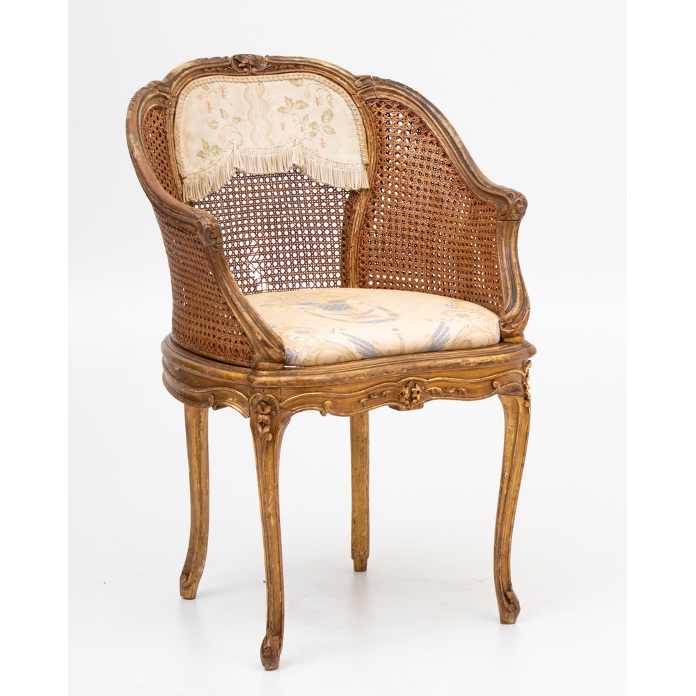 POLTRONA stile Luigi XV in legno dorato con schienale in finocchino e seduta in tessuto.