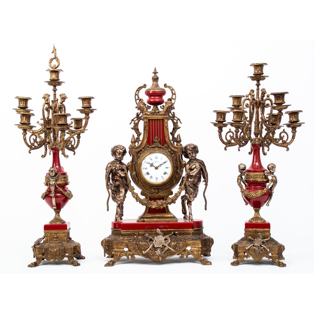 in bronzo composto da orologio e coppia di candelabri a sei fiamme.