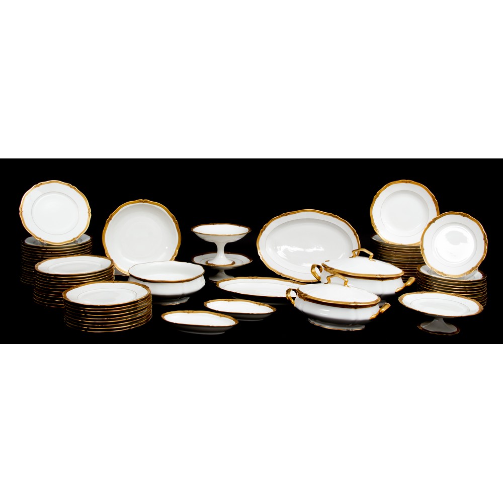 Servizio di piatti in porcellana nei toni del bianco con bordure in oro, composto da