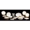 15 piatti fondi, 38 piani, 12 frutta 2 piatti da portata tondi, 2 piatti da portata ovali, insalatiera, 3 alzate, 2 zuppiere, 2 raviere.
