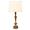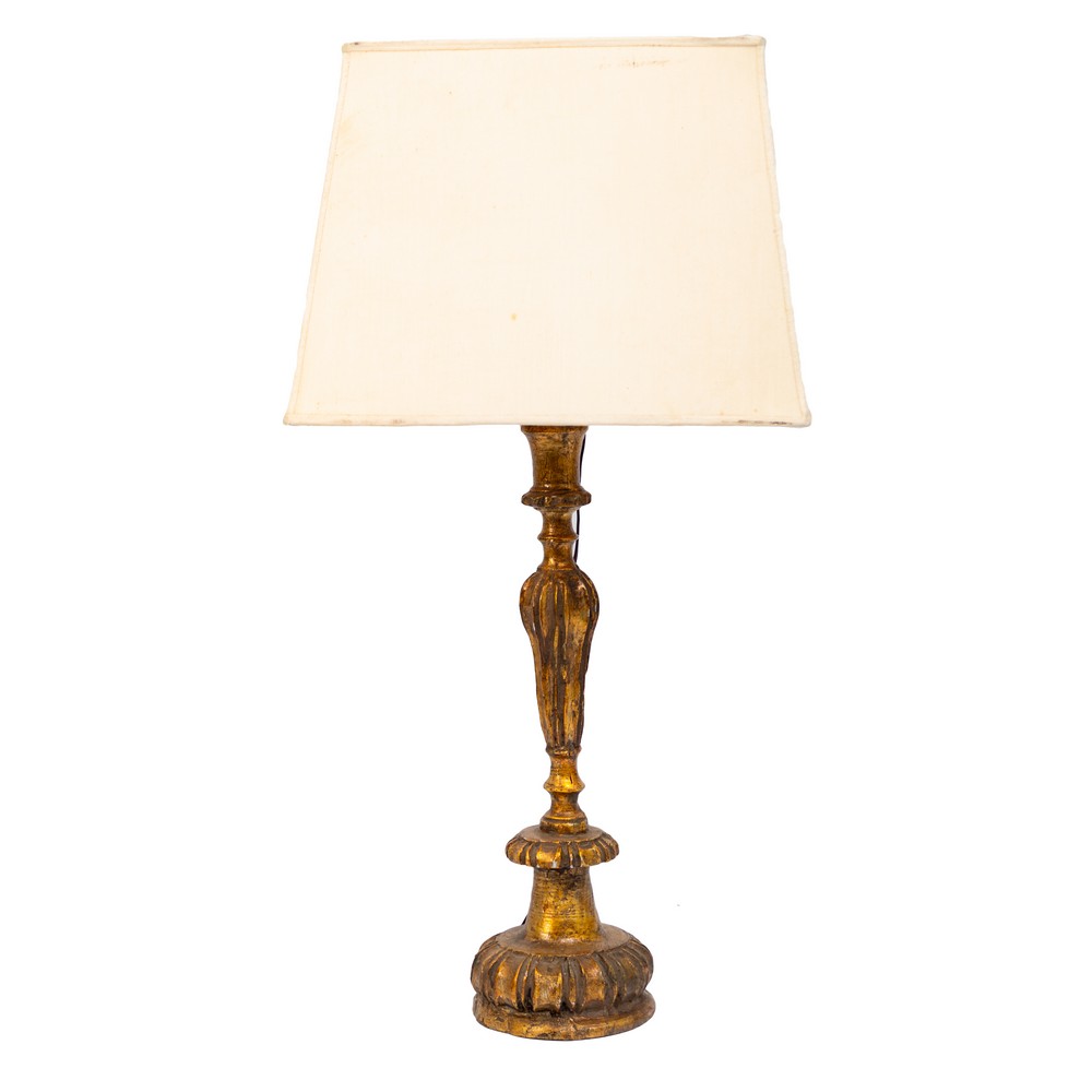 Coppia torcieri in legno dorato (elettrificati, un paralume mancante).