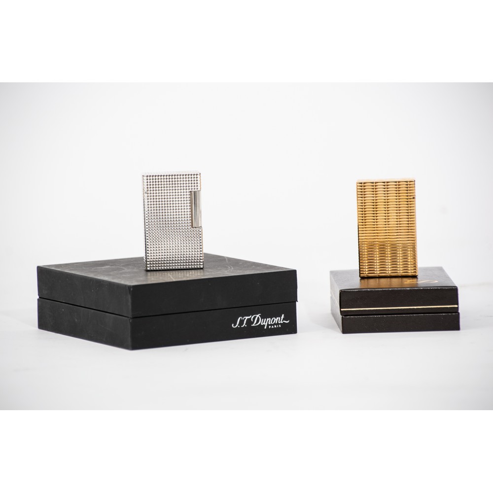 Accendino da tasca in acciaio argentato ed accendino da tasca in acciaio dorato, entro custodie originali.