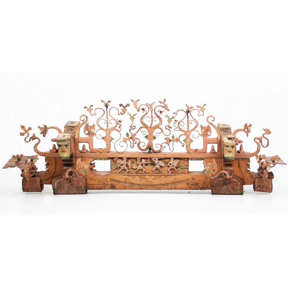 Cassa da fuso in legno scolpito e ferro lavorato a mano raffigurante "Battaglia tra paladini"
