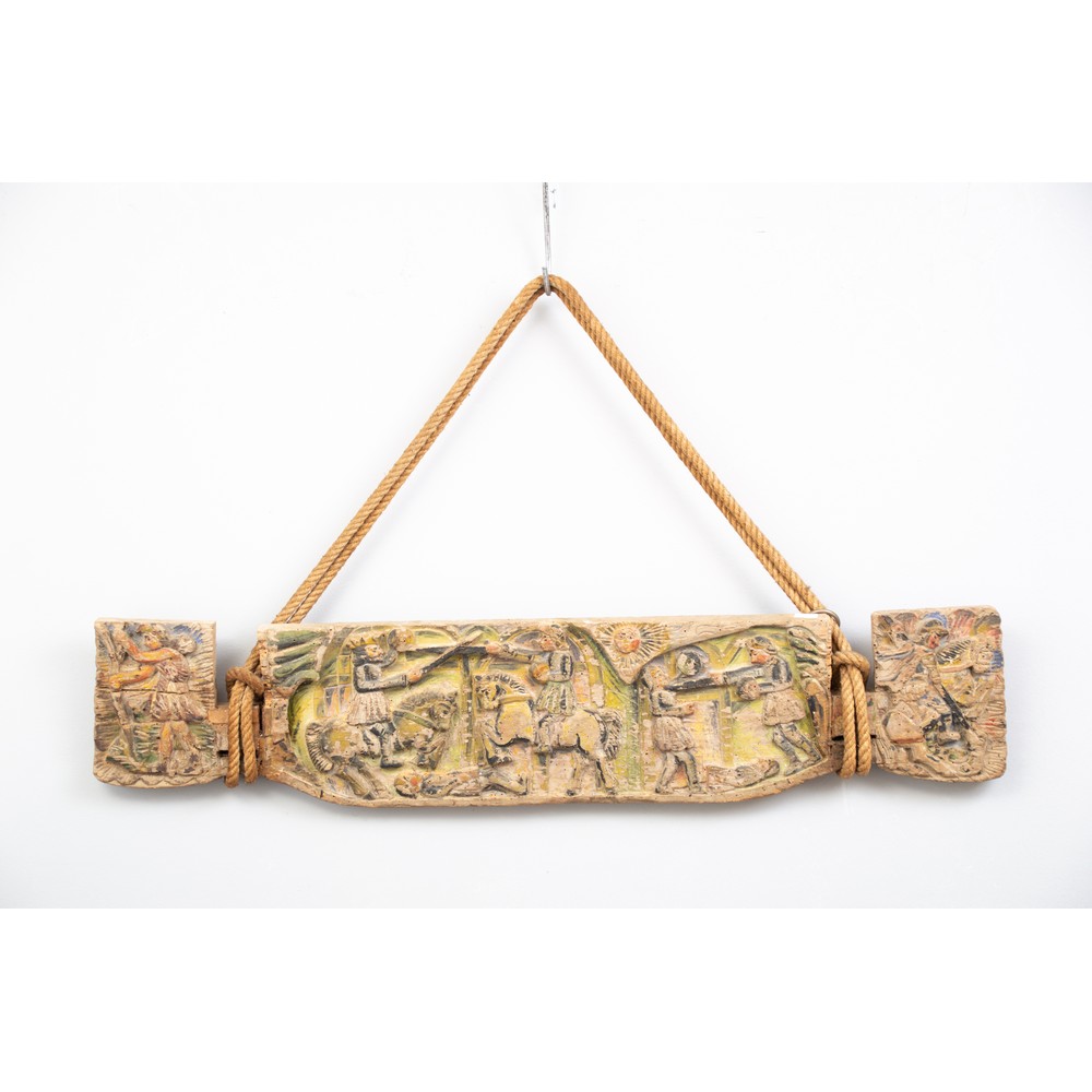 Chiave di carretto siciliano in legno intagliato raffigurante "Battaglia tra paladini".
