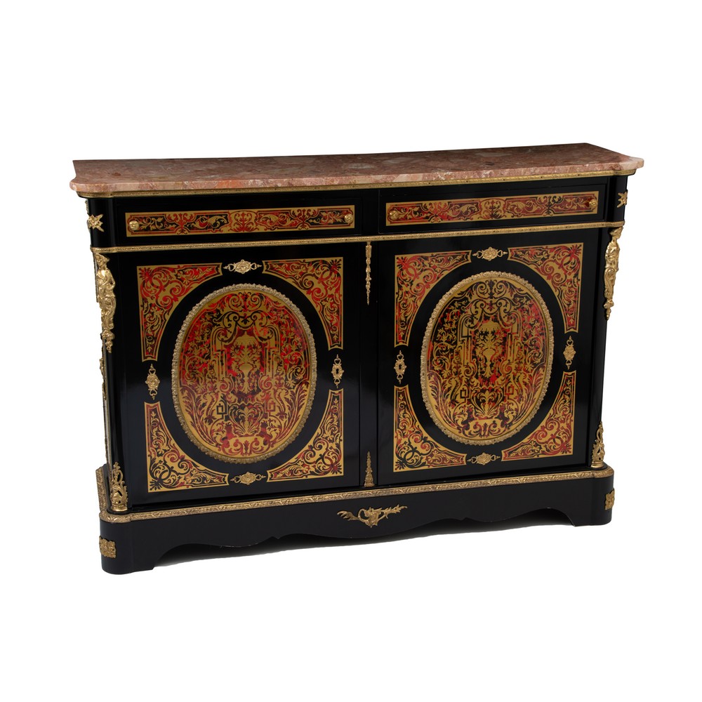 CREDENZA Stile Boulle a due ante con tarsie in tartaruga e rame con elementi in bronzo dorato, piano in marmo rosso venato.