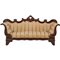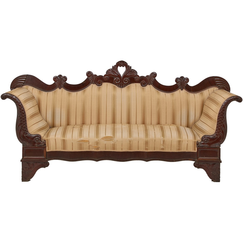 DIVANO A BARCA Impero a tre posti in legno di mogano, tappezzeria nei toni del giallo (usure).