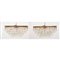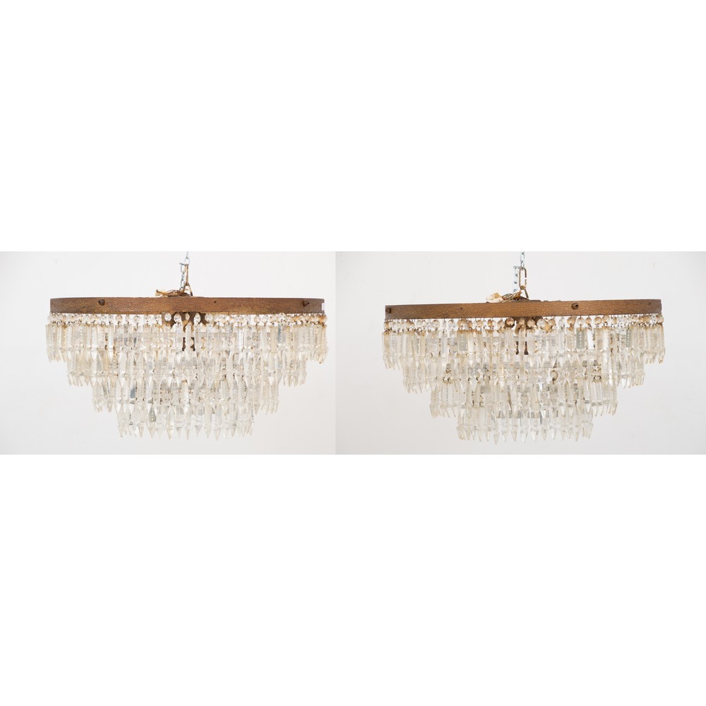 COPPIA LAMPADARI, struttura a quattro ripiani in ferro ed ottone, pendenti in vetro.