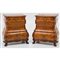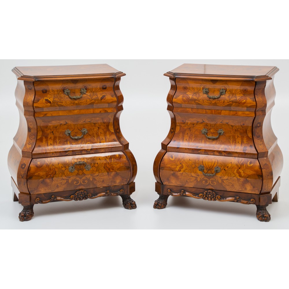COPPIA COMODINI di gusto olandese a tre cassetti in legno di noce, tarsie in bosso.