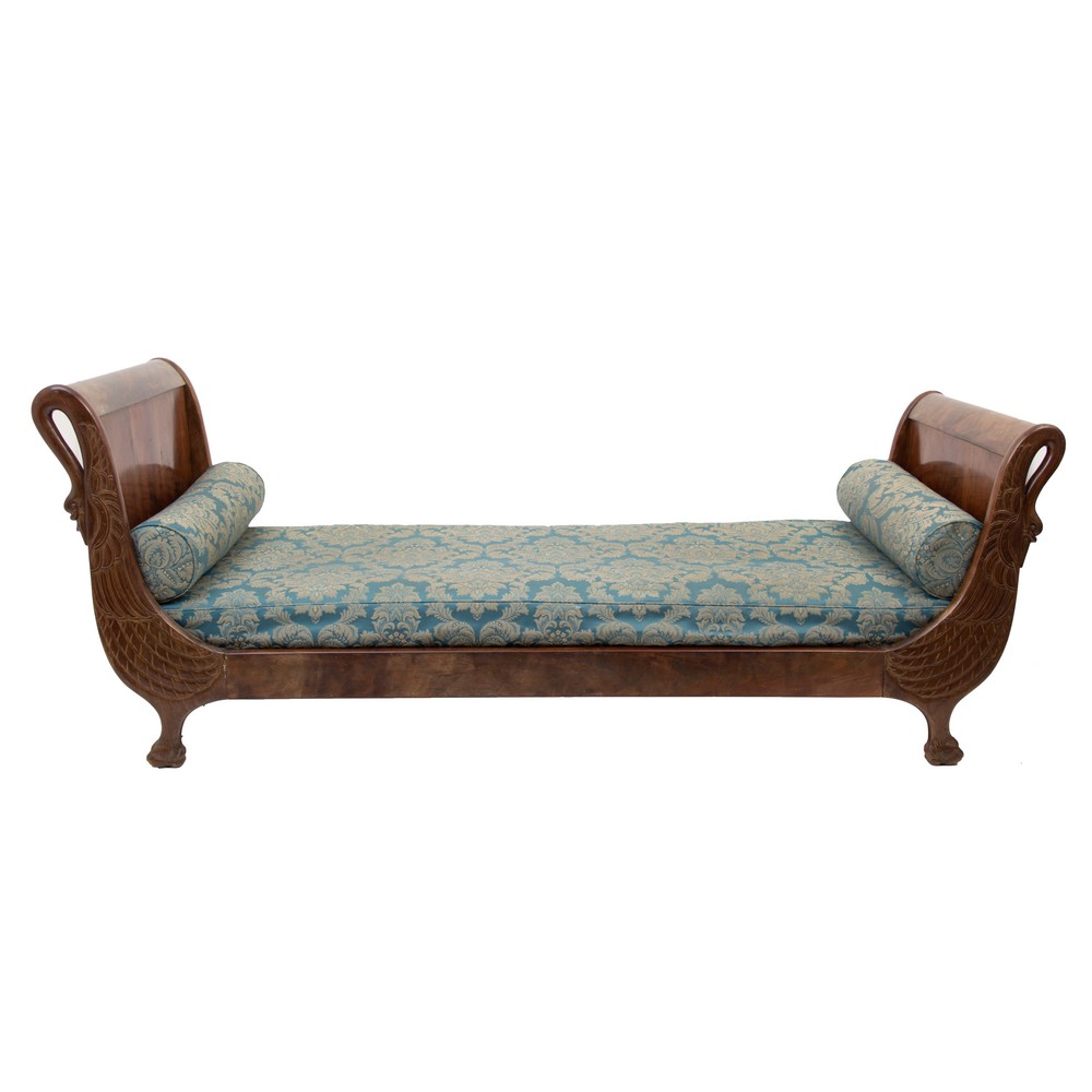 DIVANO Impero a barca con laterali lavorati a motivo di cigni in legno di mogano.