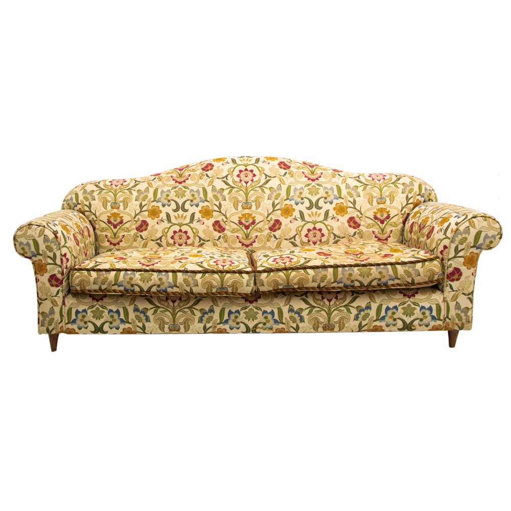 con struttura in legno e tappezzeria decorata a motivo floreale e naturalistico.