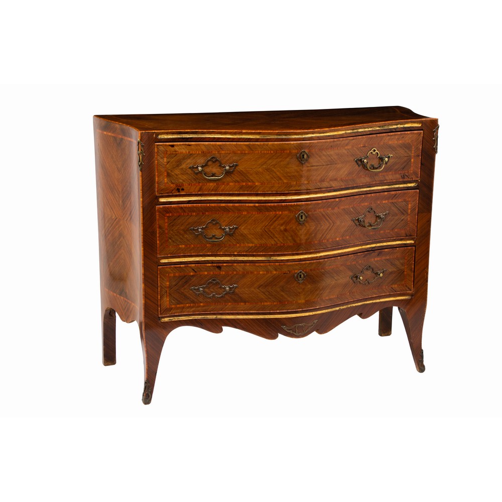 a tre cassetti in legno di palissandro e tarsie in boi de rose, maniglie e fregi in bronzo.