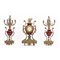 Trittico composto da orologio e da due candelabri in ceramica nei toni del bordeaux, basi ed elementi in antimonio dorato.
