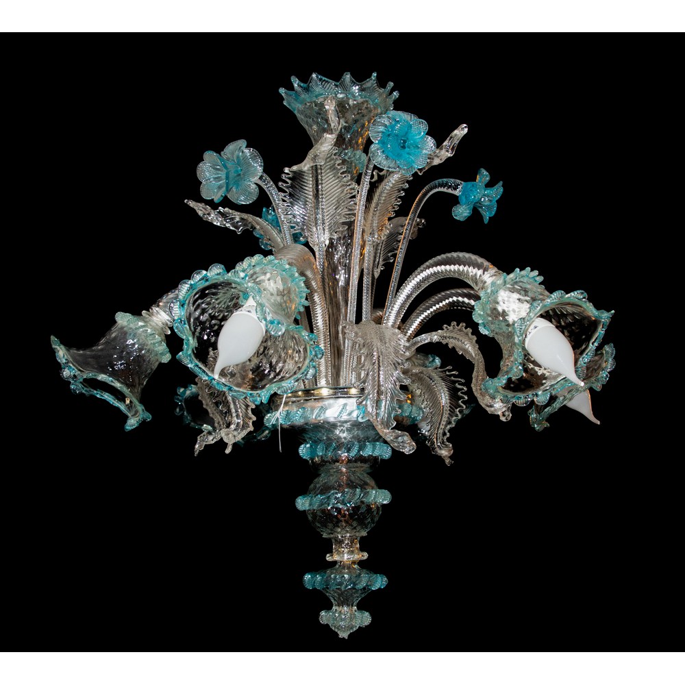 LAMPADARIO a sei luci in vetro di murano nei toni del bianco e blu.