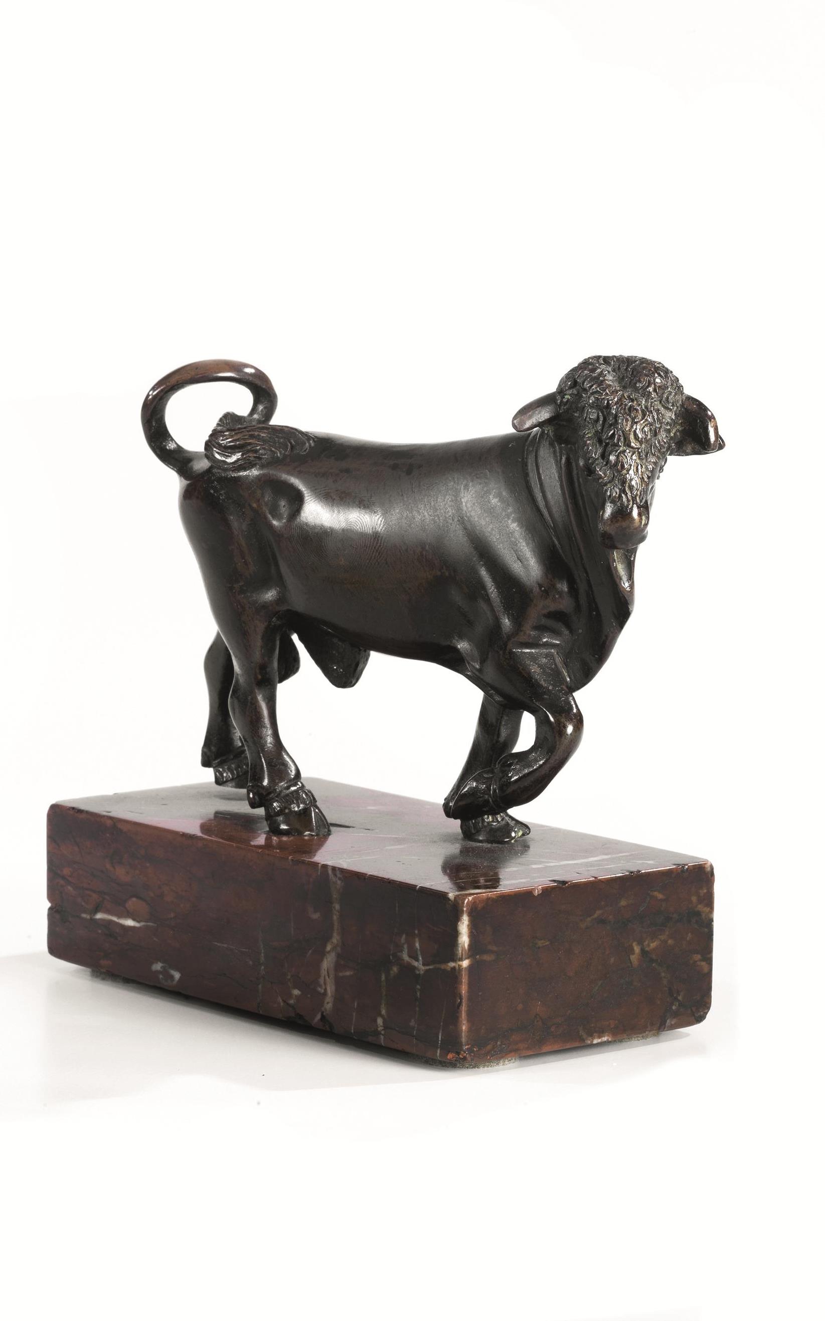 Scultura, Scuola toscana sec. XVII, in bronzo modellata come un toro, cm 11x14, su base in marmo rosso venato