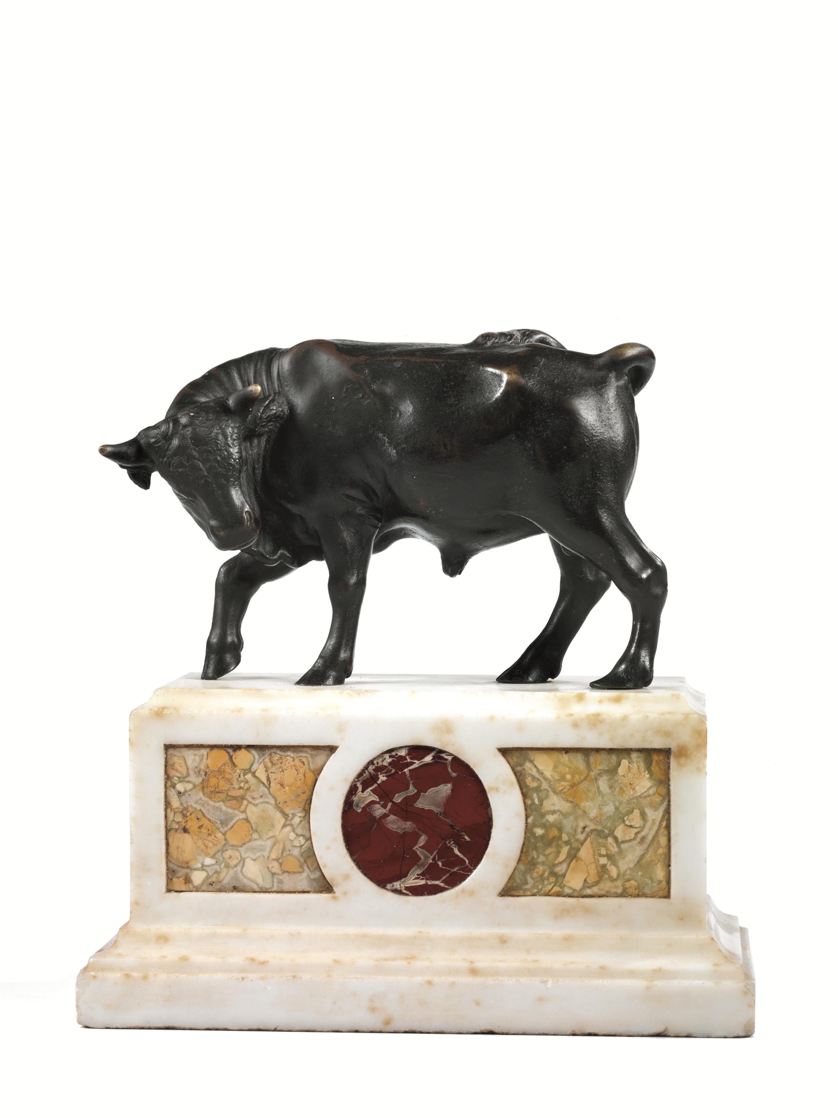 Scultura, Scuola fiamminga, sec. XVII, in bronzo, modellata come un toro in atto di caricare, cm 10x14, su base in marmi policromi