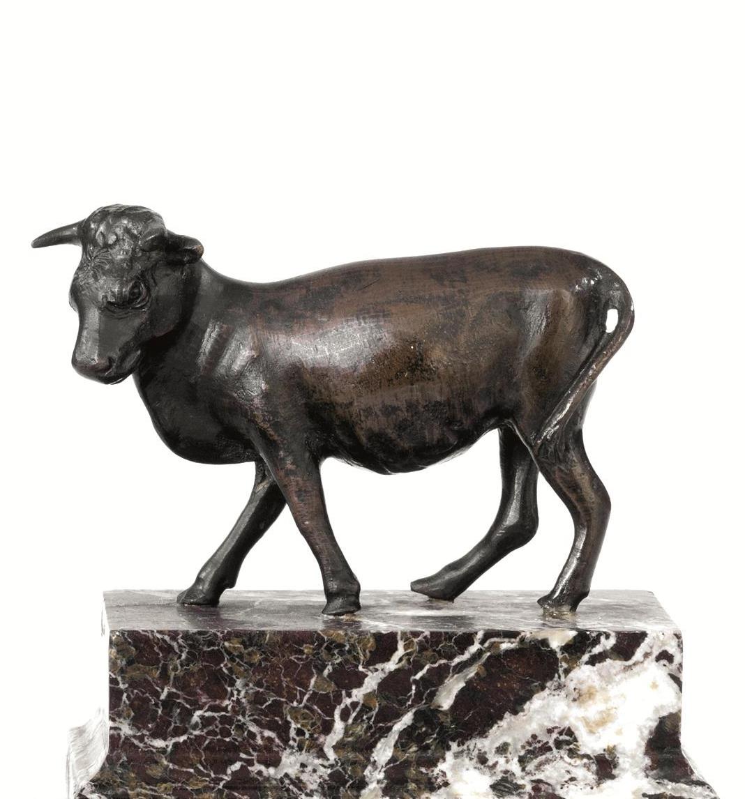 Piccola scultura, Arte fiamminga sec. XVII-XVIII, in bronzo, modellata come un vitello, cm 9x7, su base in marmo venato