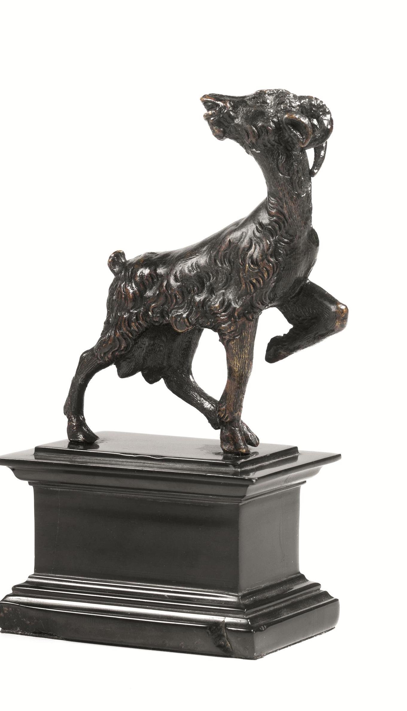 Scultura, Scuola veneta sec. XVII, alla maniera del Riccio, scultura in bronzo modellata come un caprone, cm 10x8, su base in marmo nero