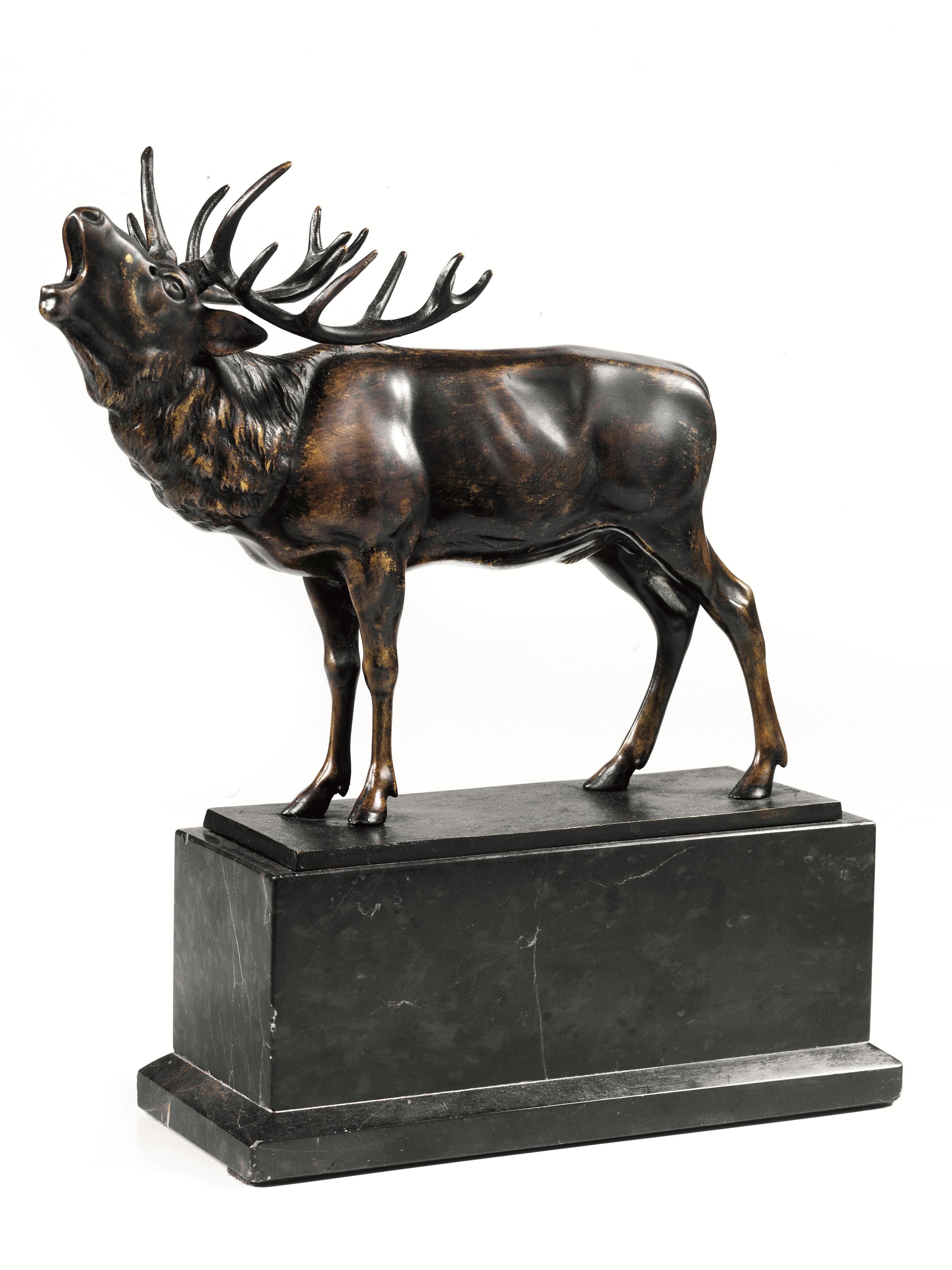 Scultura, sec. XX, modellato come un cervo, cm 22x28, su base in marmo nero, firmata W. Robra