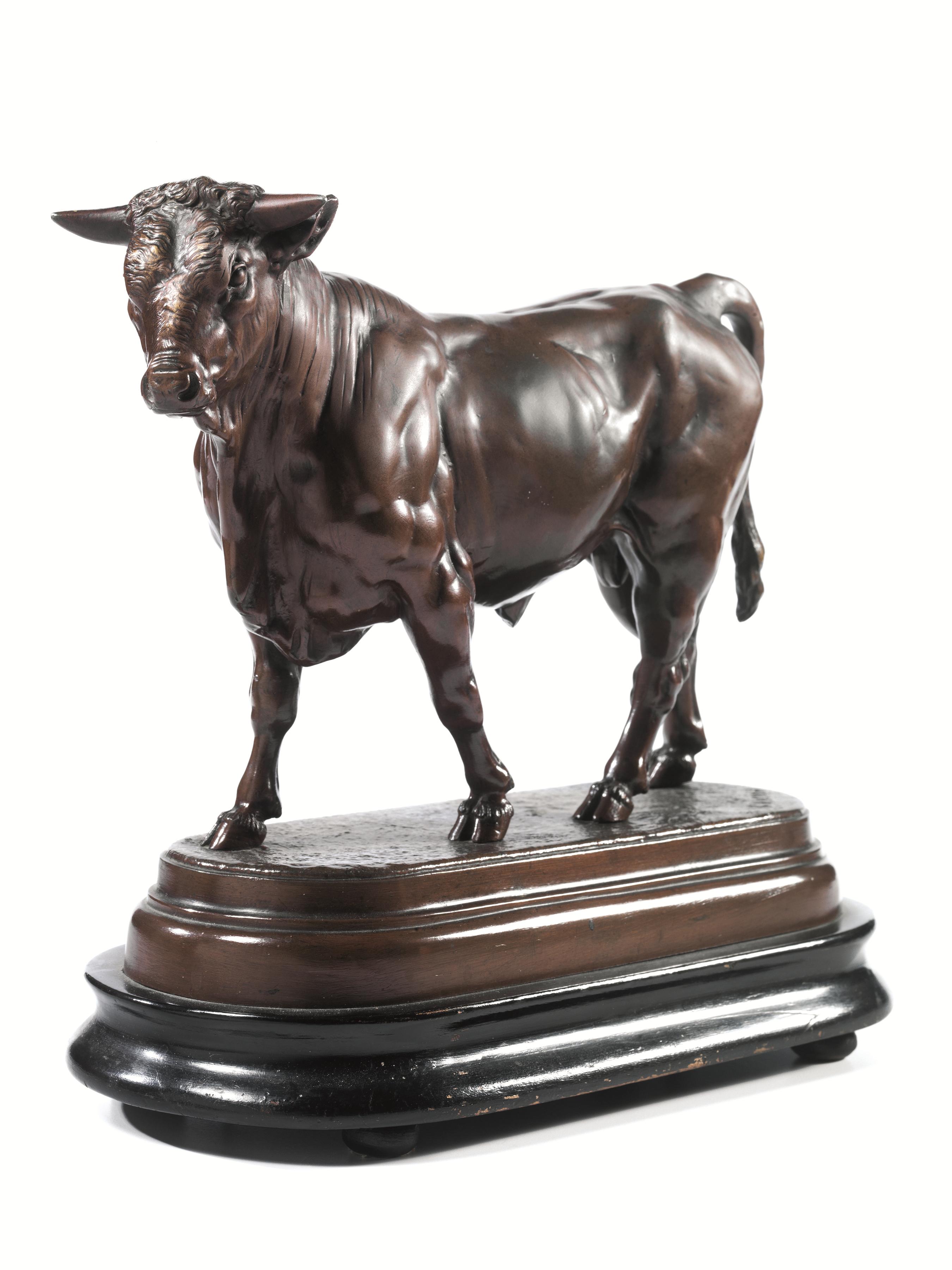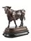 Scultura, Francia, sec. XX, in metallo modellato come un toro su base ovale, cm 23x28, poggiante su base in legno ebanizzato, firmata C. Valton (1851-1918)