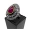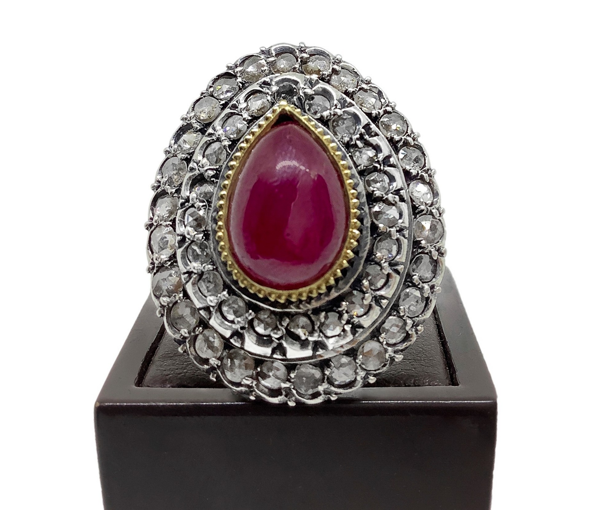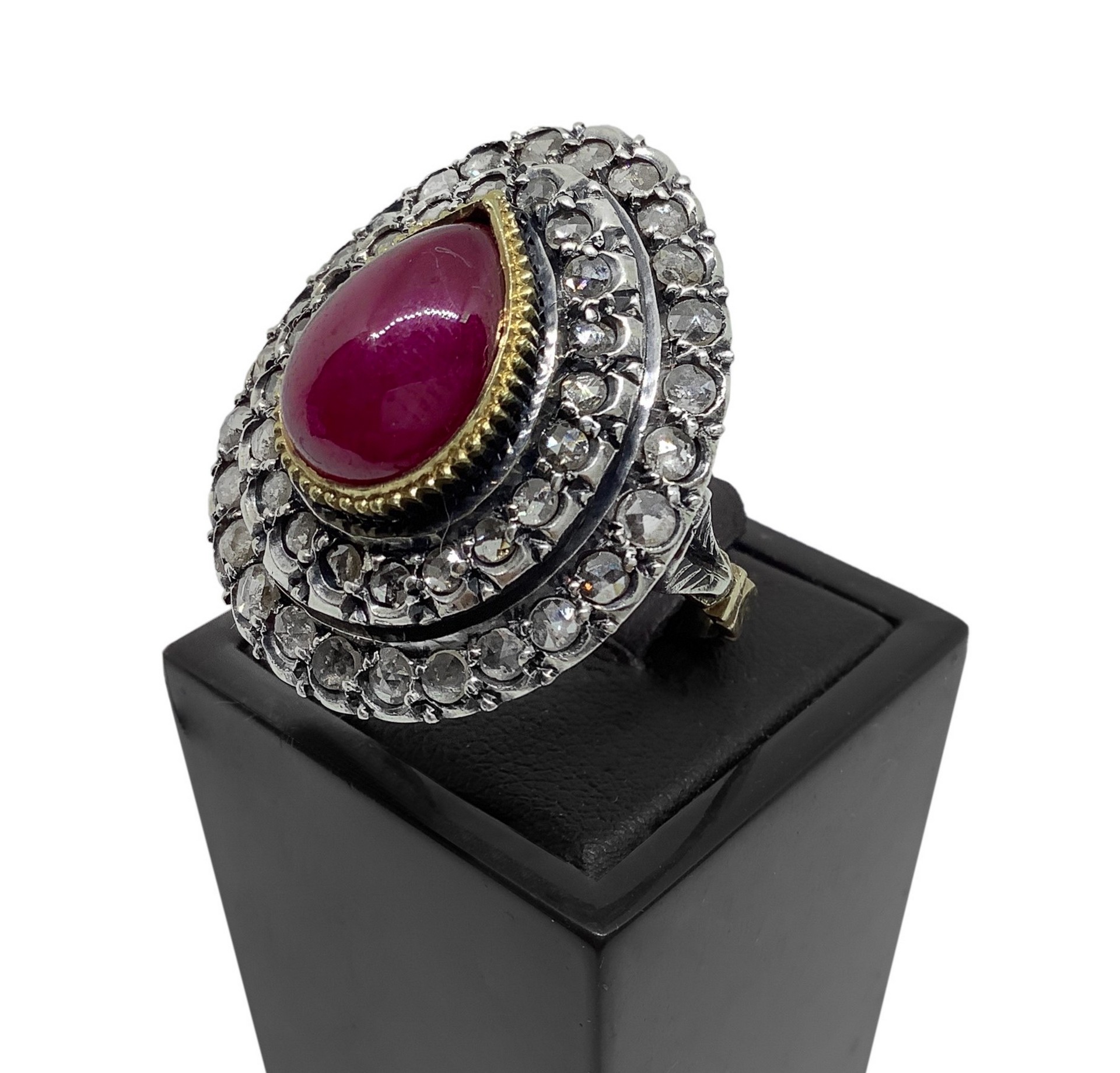 Anello in oro 12 carati con radice di rubino a goccia cabocon e doppio giro di diamanti