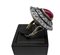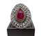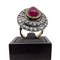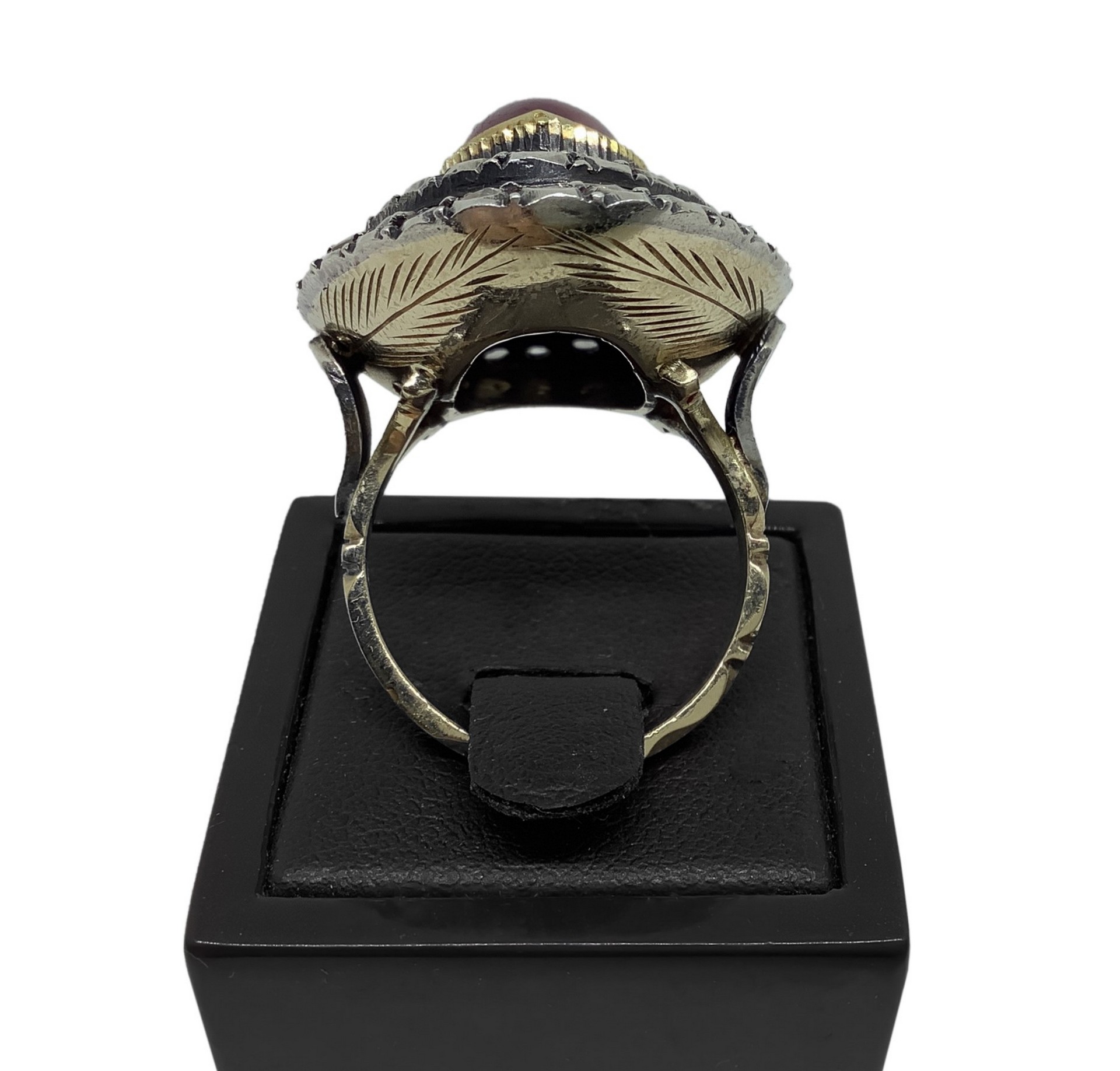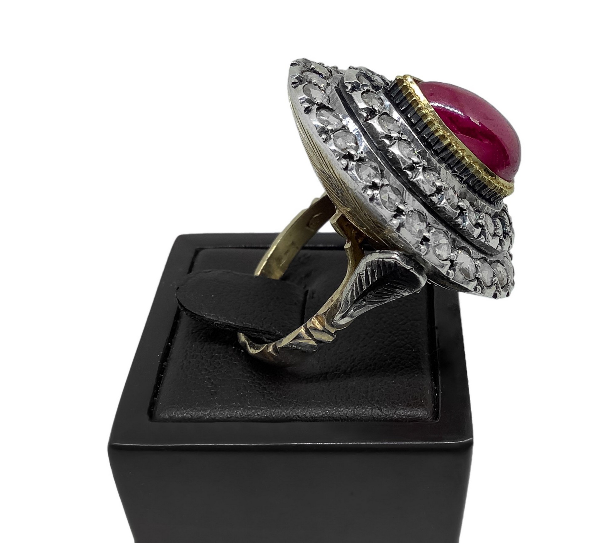 Anello in oro 12 carati con radice di rubino a goccia cabocon e doppio giro di diamanti misura 18, gr 14,2