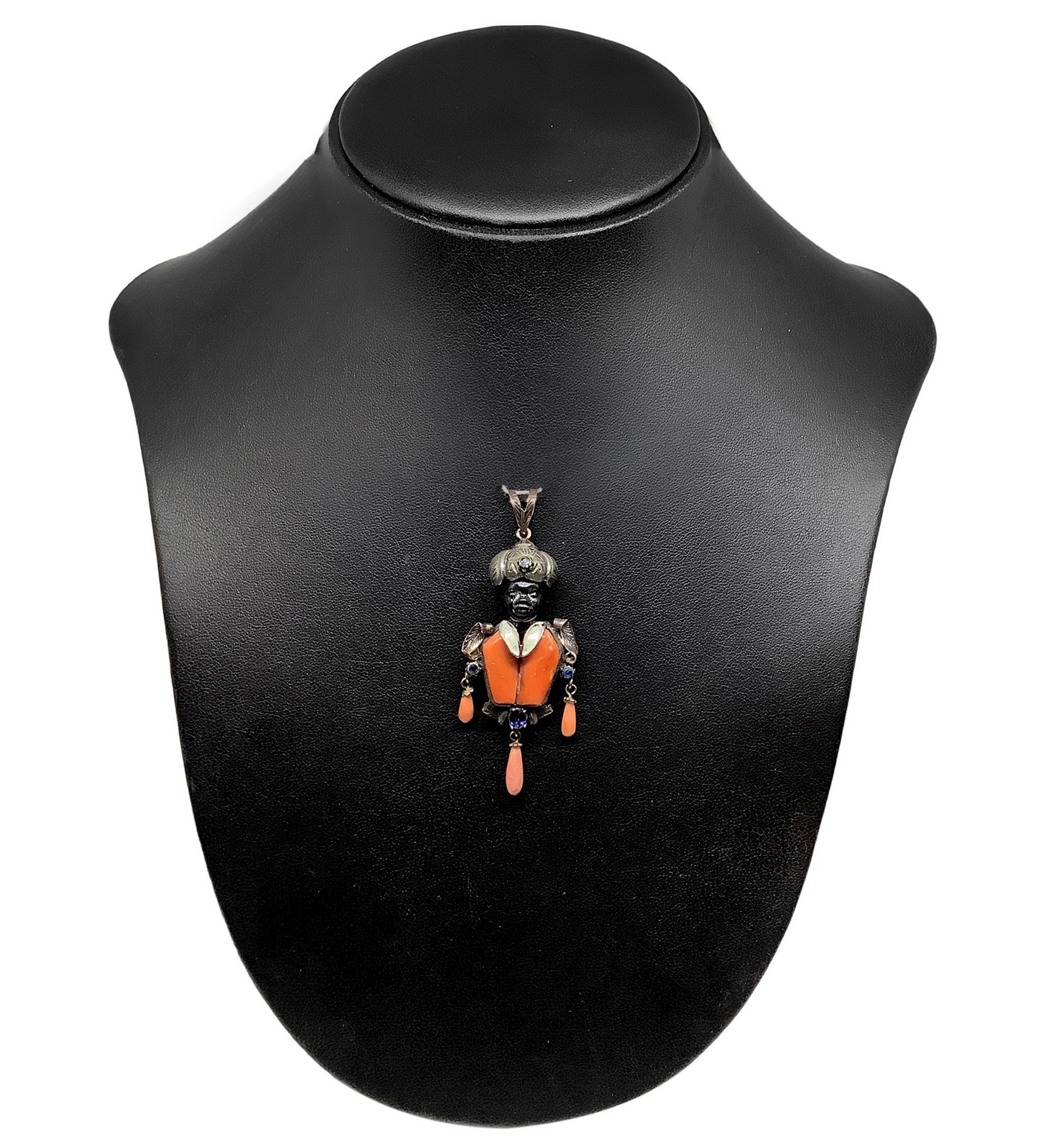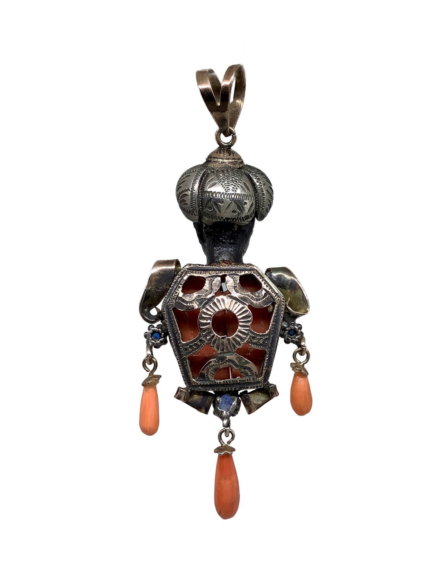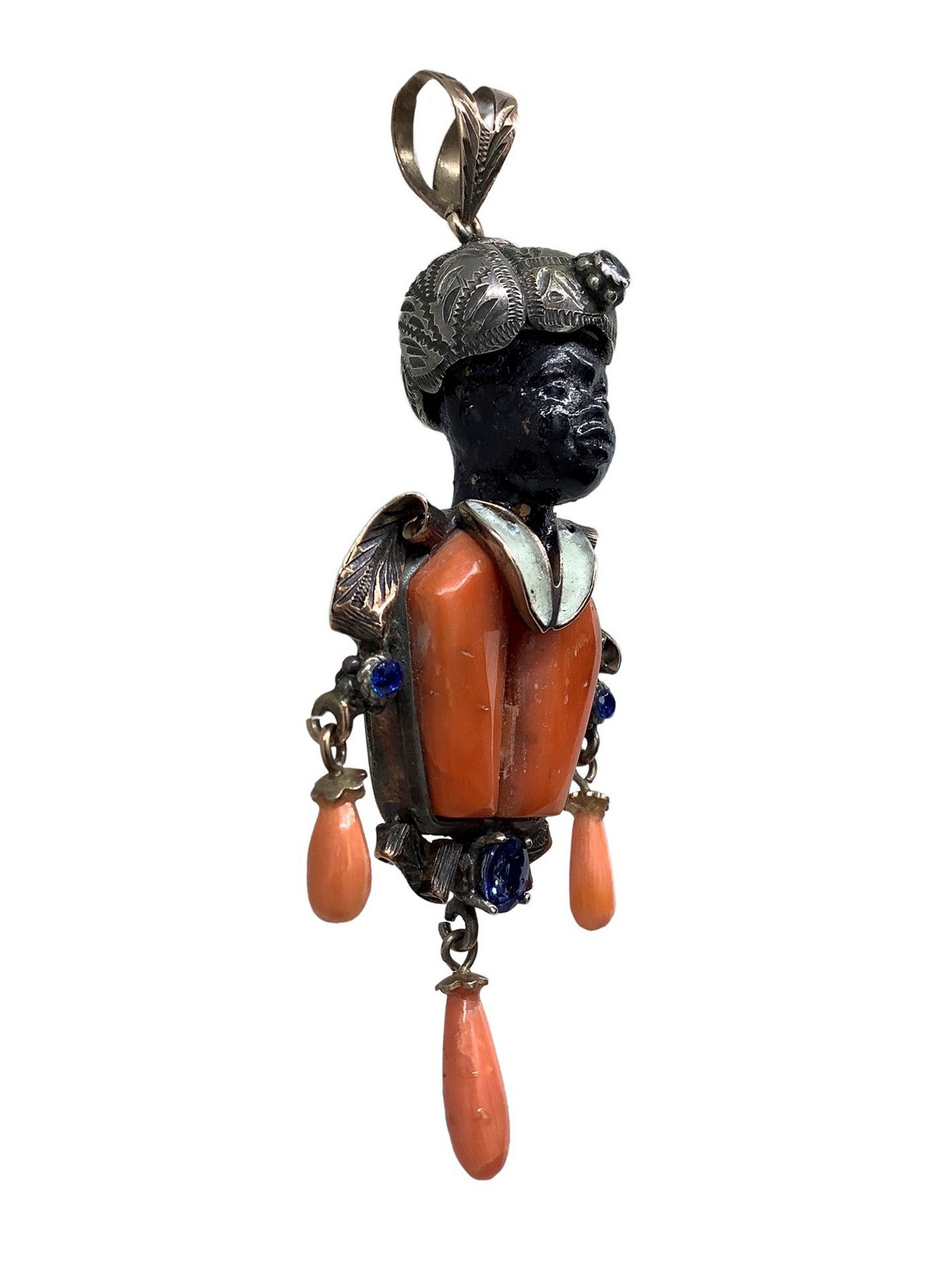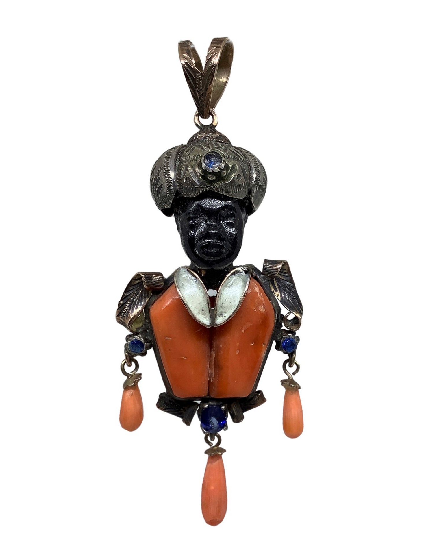 Ciondolo a forma di moro in oro basso titolo, argento e corallo