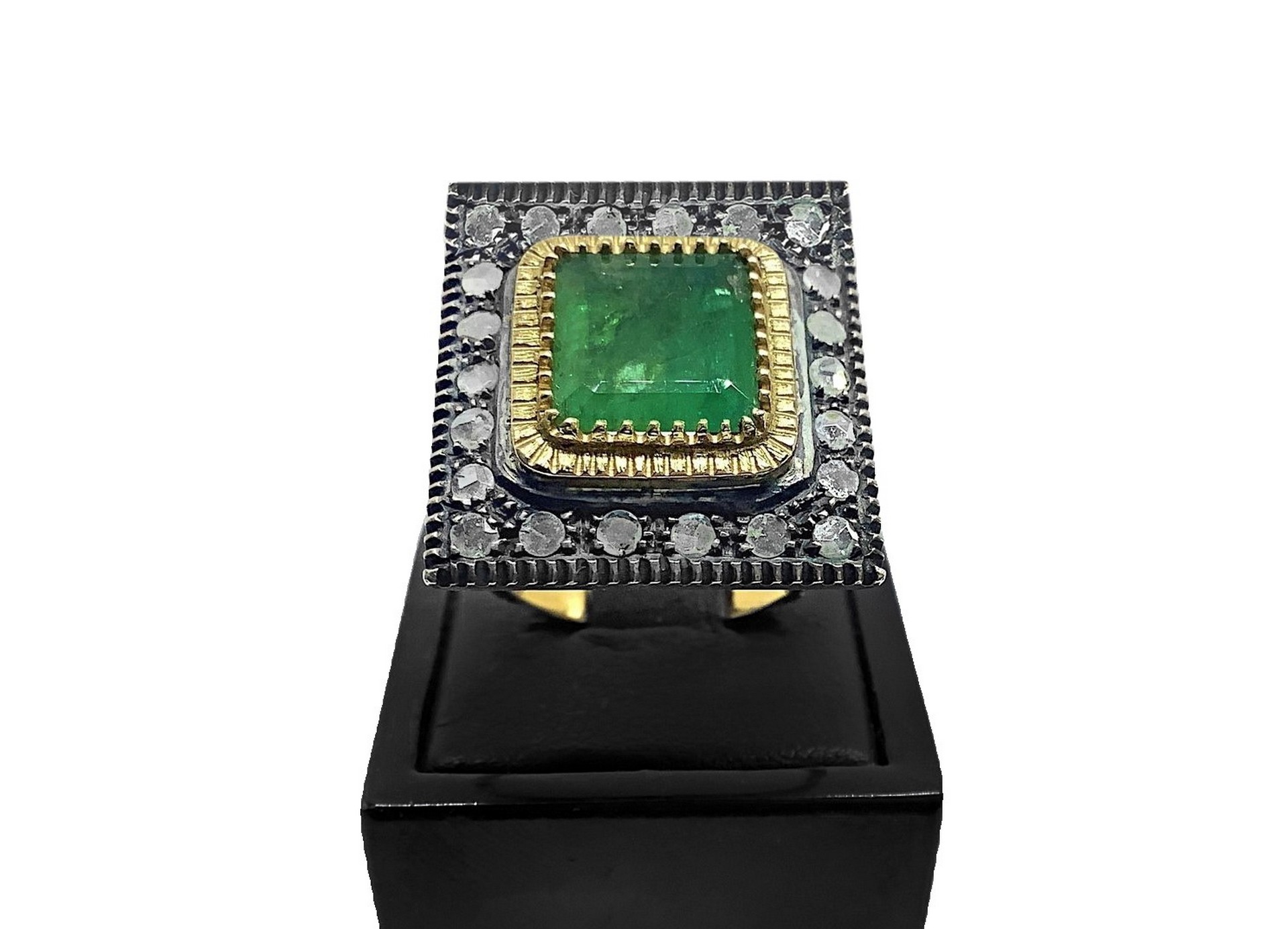 Lot 157 | Anello in oro e argento con rosette di diamanti e radice smeraldo centrale