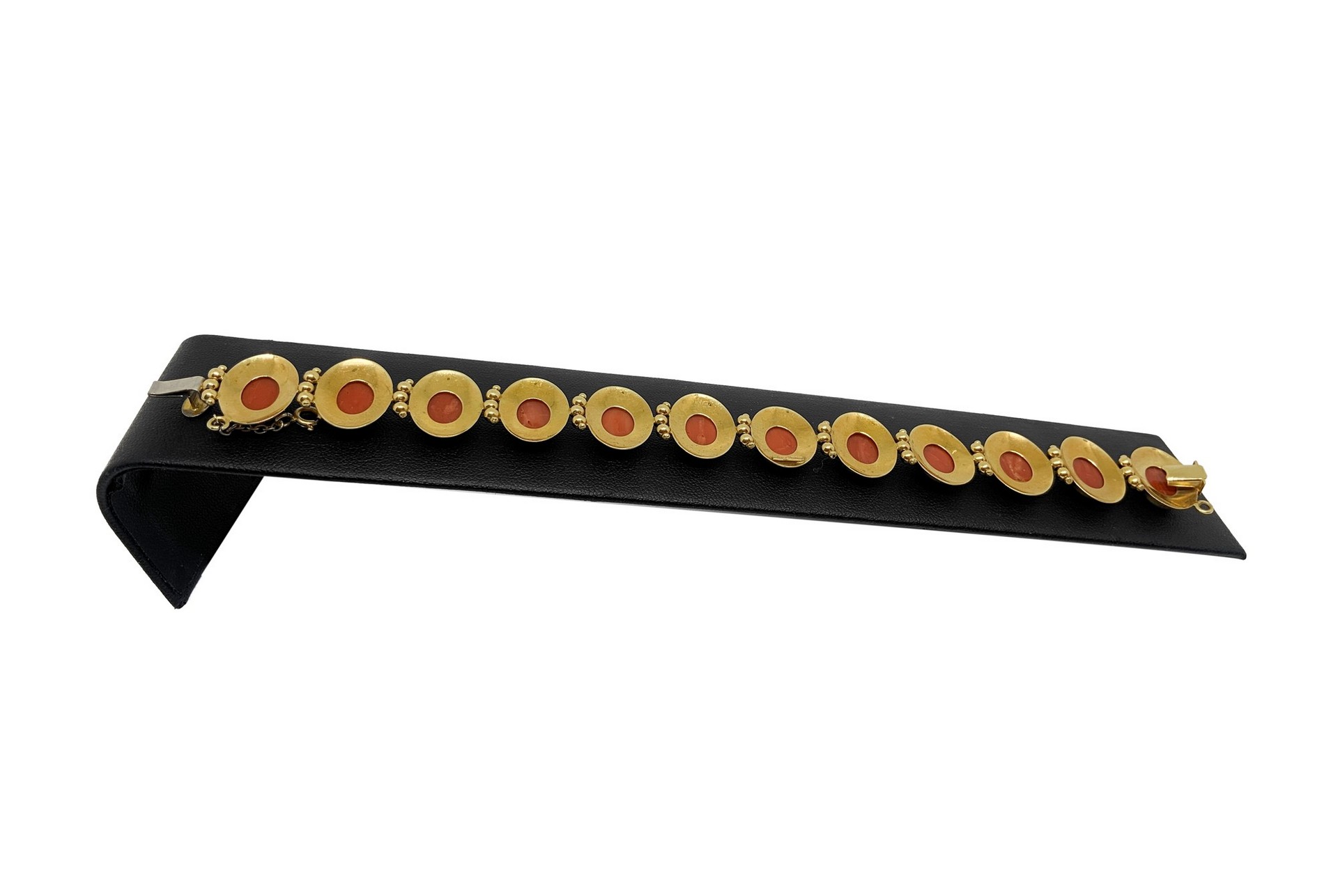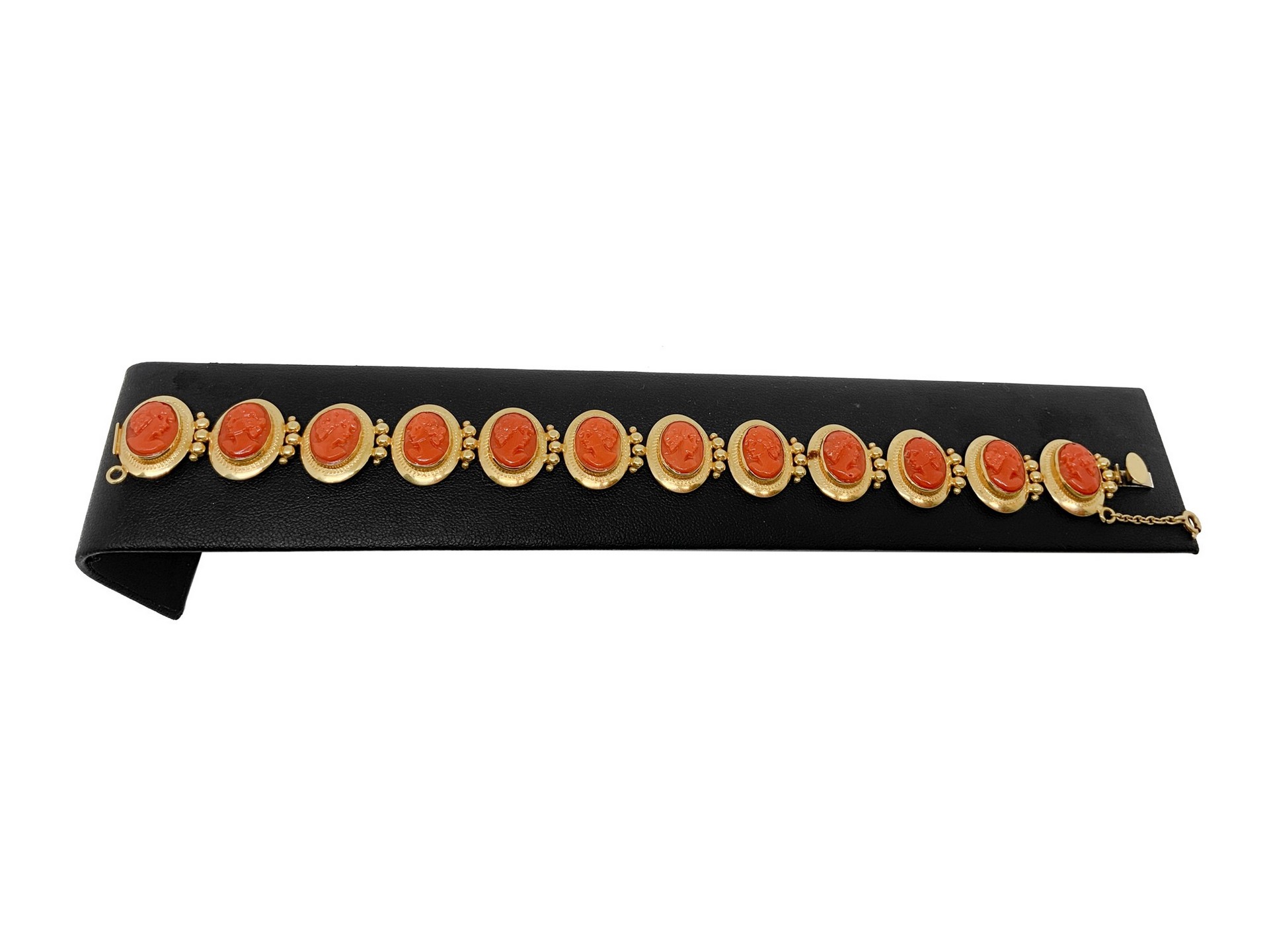 Bracciale in oro con cammei, 20° secolo Gr. 23,3 Lavorazione in oro rosso con dodici cammei in corallo rosso raffiguranti visi di donna