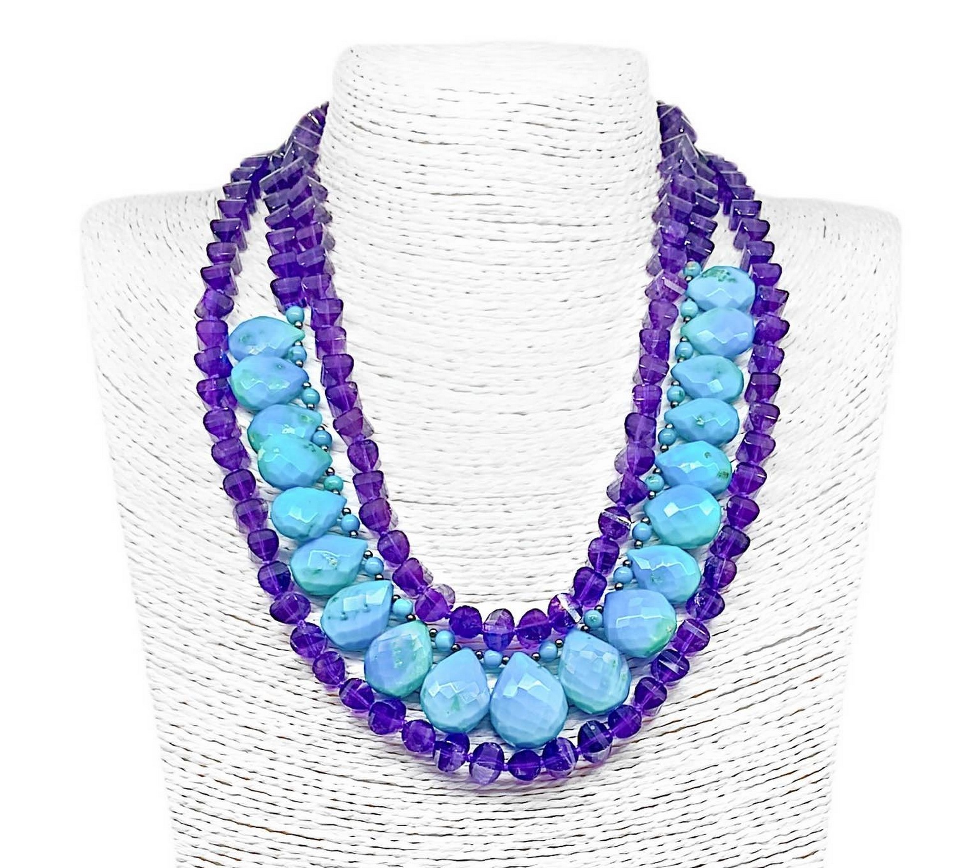 Collana tre fili di AMETISTA sfaccettata, con al centro gocce di TURCHESE ARIZONA Ametista mm 8,Lunghezza cm 60 chiusura in Argento satinato.