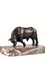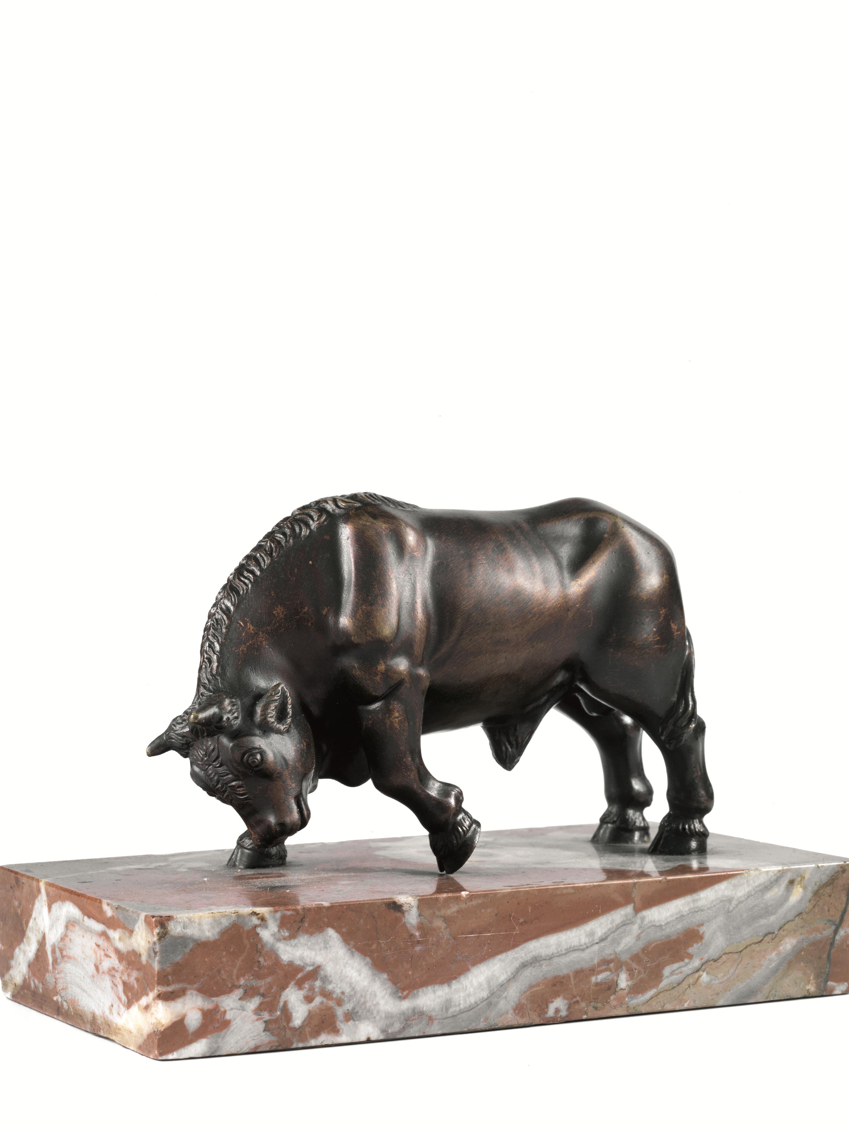 Scultura, Scuola fiamminga metà sec. XVII, in bronzo, modellata come un toro in atto da combattimento, patina naturale bruno scura, cm 9x16, su base in marmo