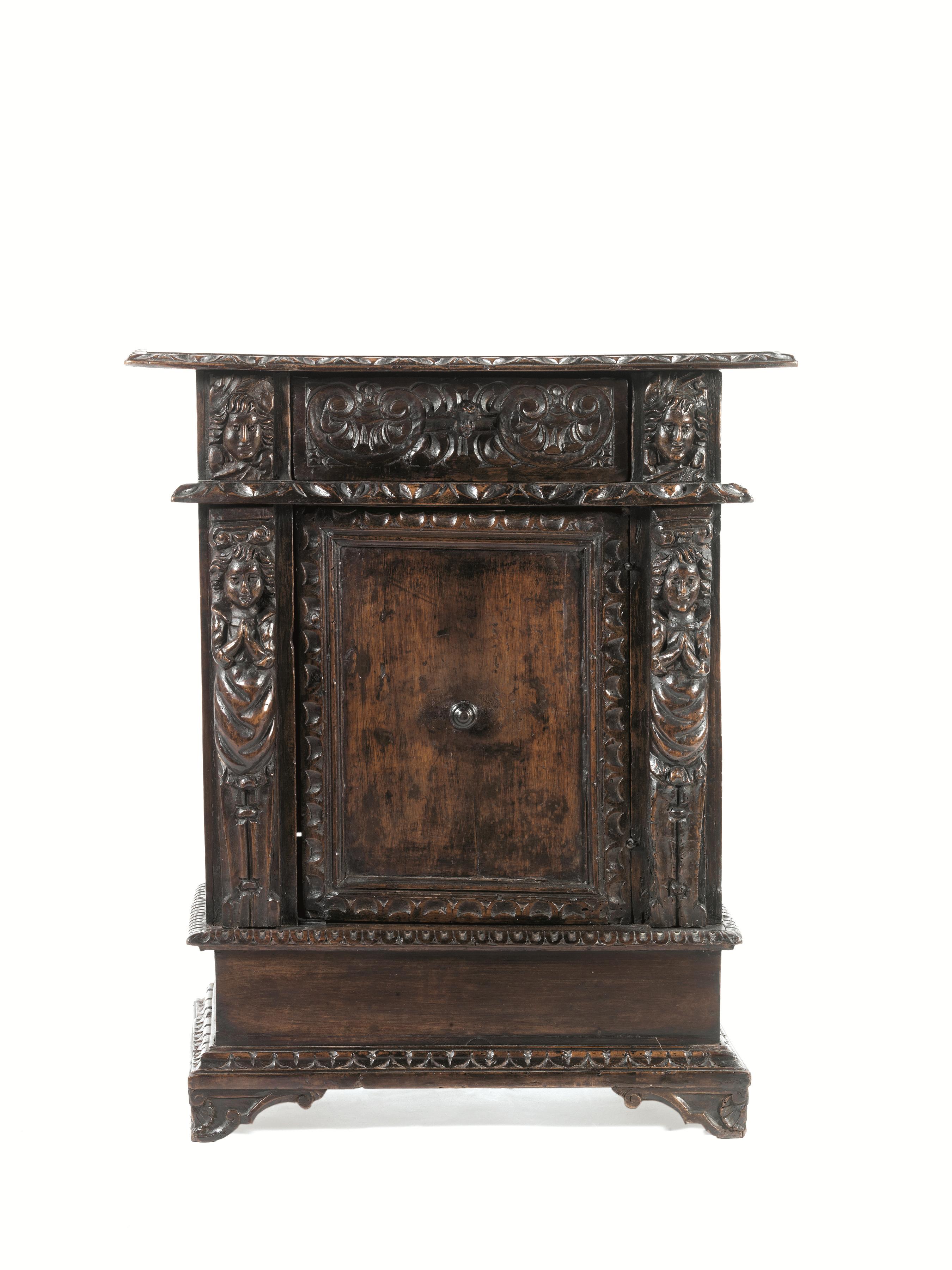 Credenzino, Liguria, metà sec. XVII, in noce a patina scura, piano rettangolare intagliato a foglie, un cassetto nella fascia e uno sportello sottostante inquadrato tra lesene a telamone con le mani giunte, base modanata, piedi a mensola, cm 73x37x85, presenta modifiche