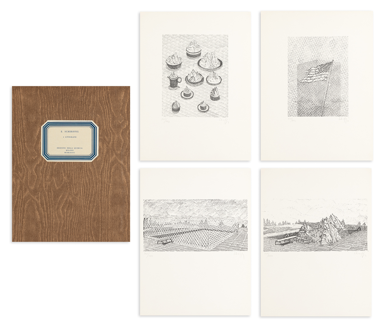 Cartella contenente 4 litografie di Elisabeth Scherffig, ciascuna recante firma e numerazione (Esemplari XVII/XXV) a matita al fronte