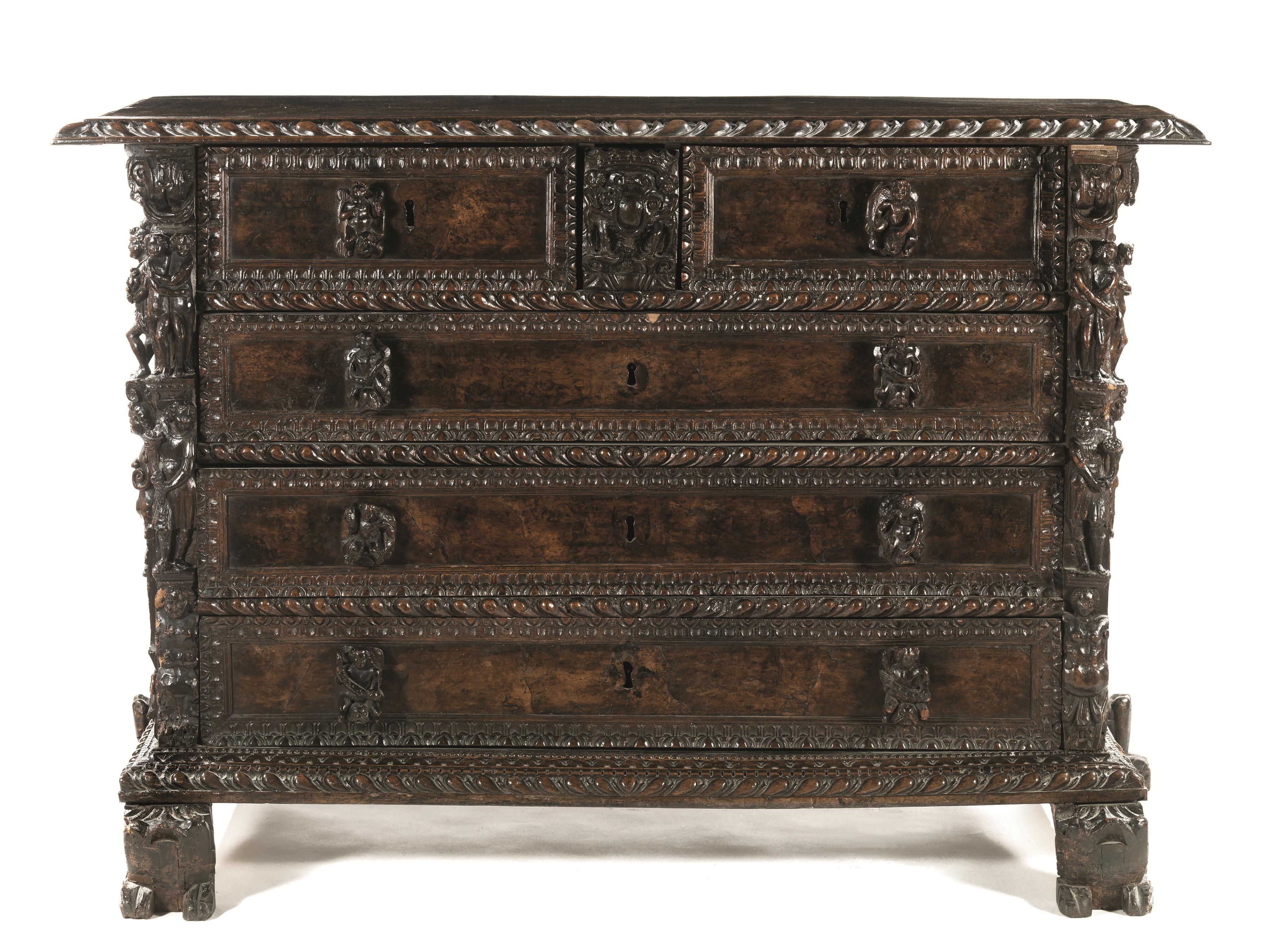 Importante cassettone a bambocci, prima metà sec. XVII, in noce scolpito a patina scura, piano rettangolare con bordo baccellato, a tre cassetti appaiati nella fascia e tre sottostanti con cornici riccamente scolpite a foglie stilizzate, specchiatura dei cassetti in radica, maniglie scolpite a putti in atto di giocare con delfini e inquadrati da lesene angolari con figure in alto rilievo, base baccellata, piedi ferini, cm 166x77x113, piccoli danni e restauri