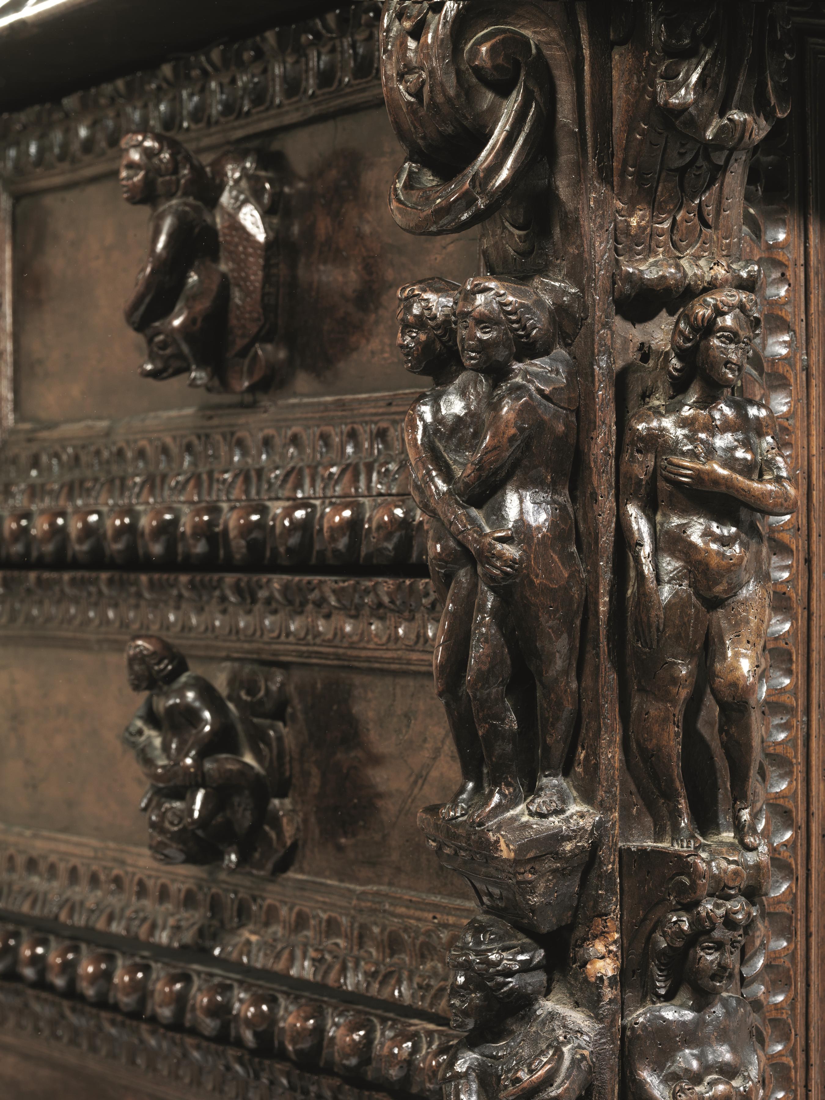 Importante cassettone a bambocci, prima metà sec. XVII, in noce scolpito a...