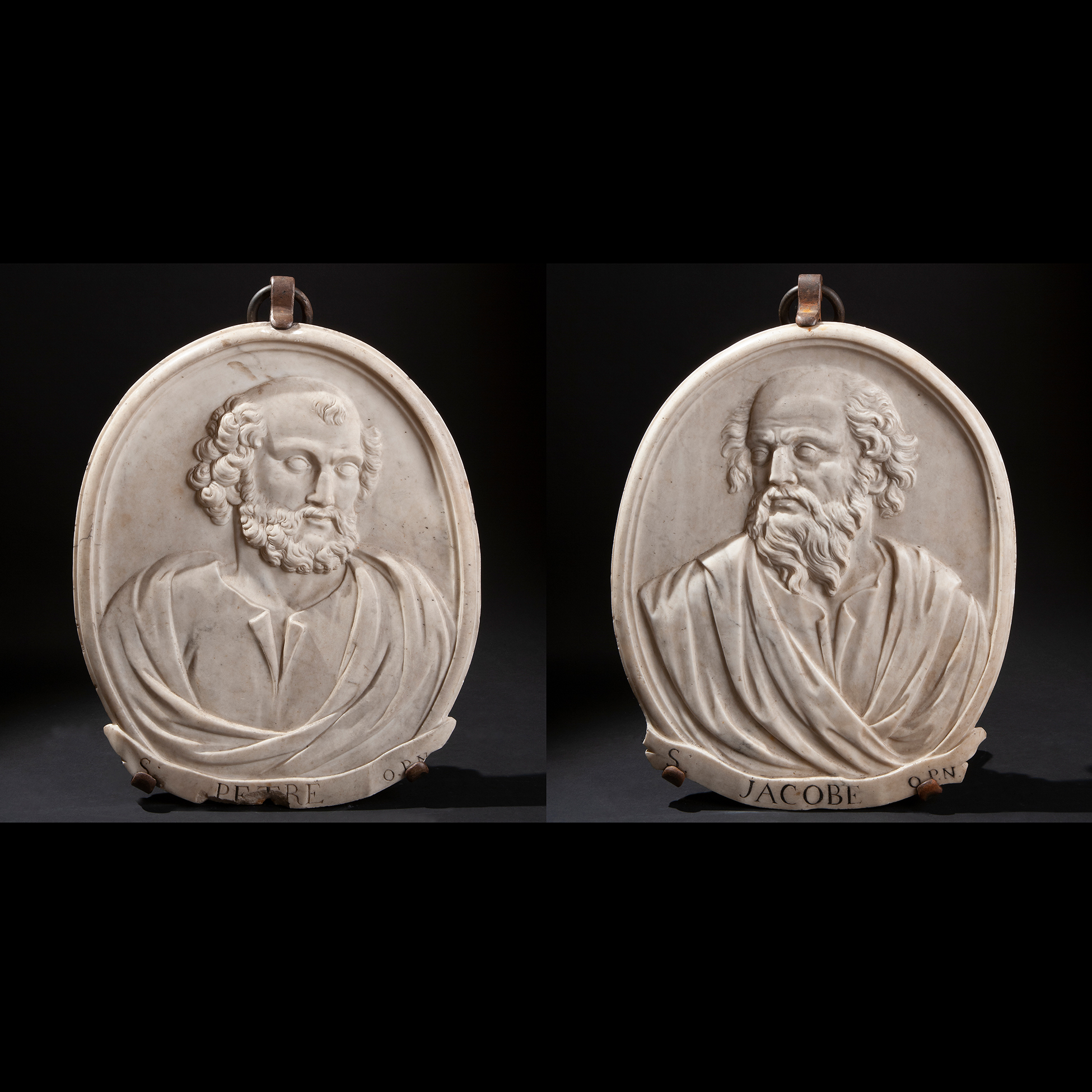 Coppia di medaglioni in marmo, Italia fine del XVII secolo I due bassorilievi raffigurano San Pietro e Giacobbe. Dimensioni 54x45 cm.