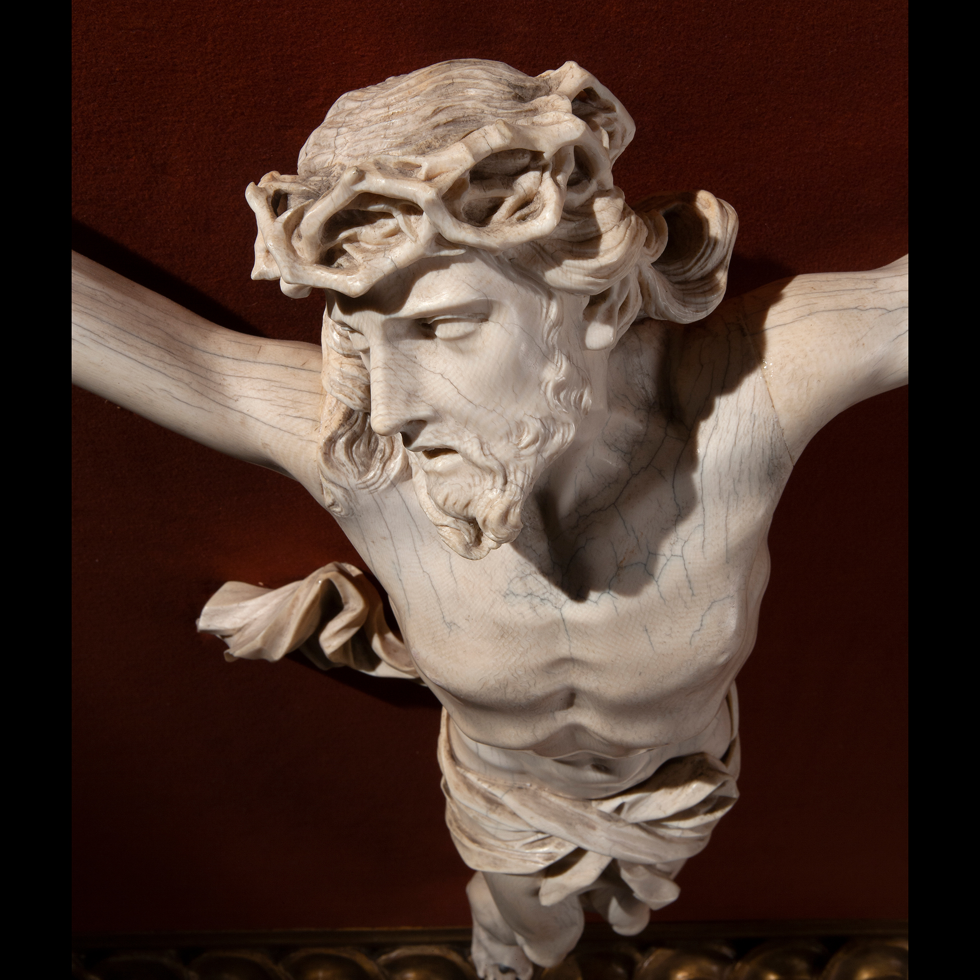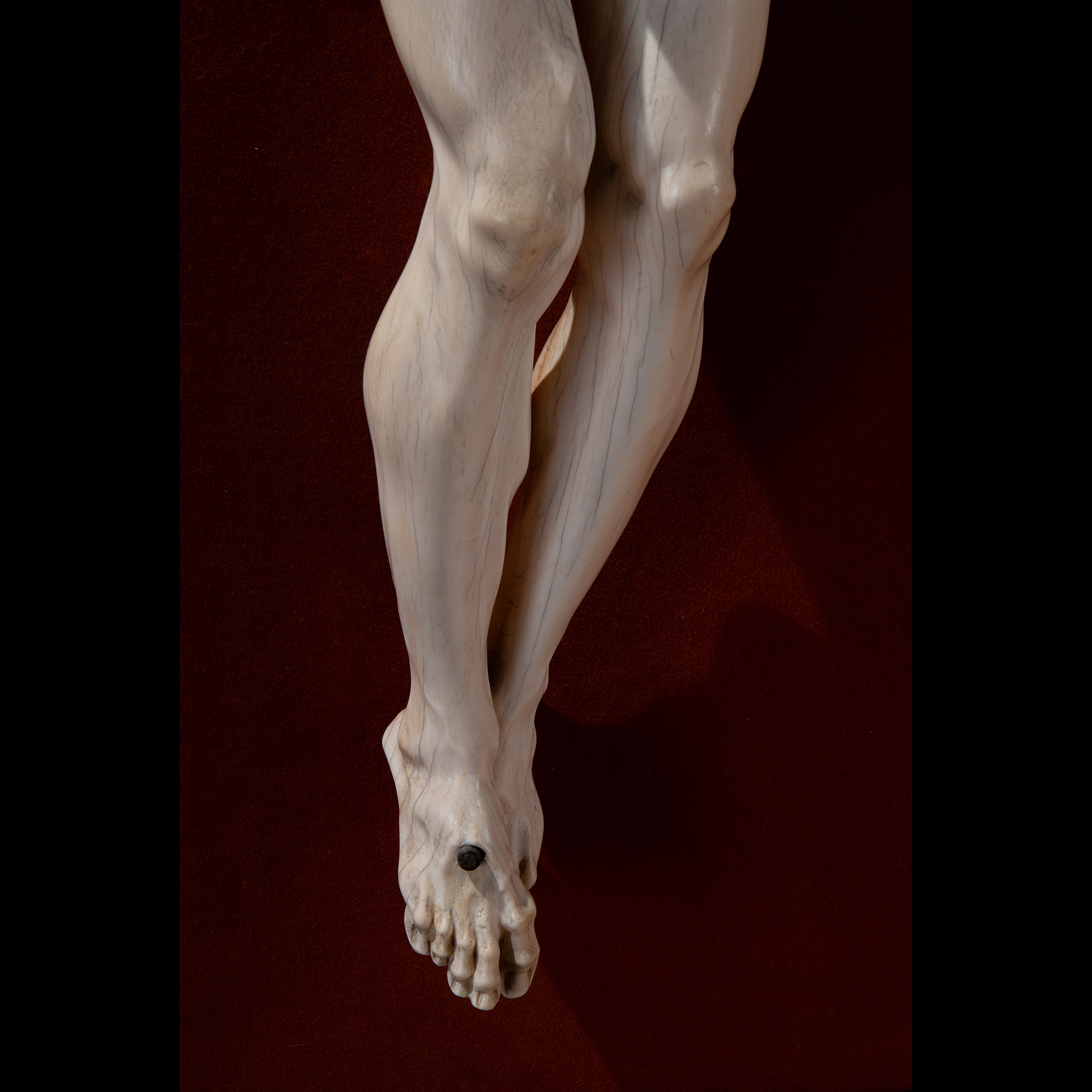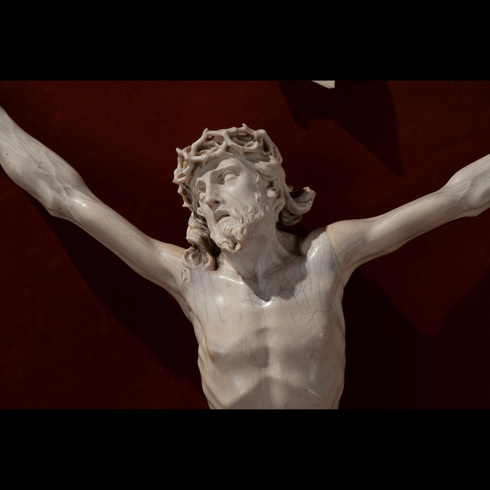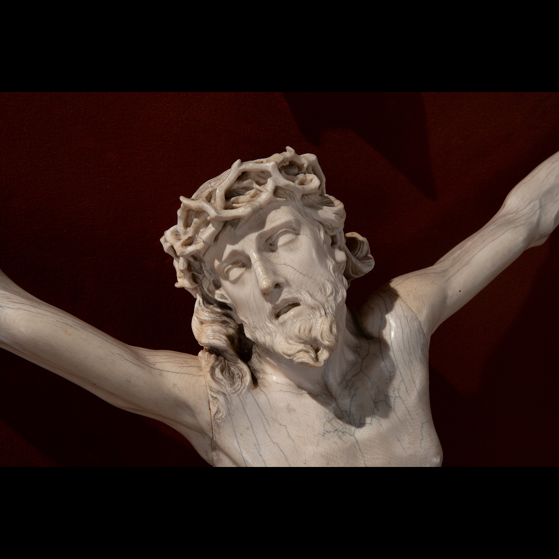 Cristo in avorio, Italia XIX secolo Scultura dotata di importante cornice dorata. Dimensioni 150x110x12 cm.