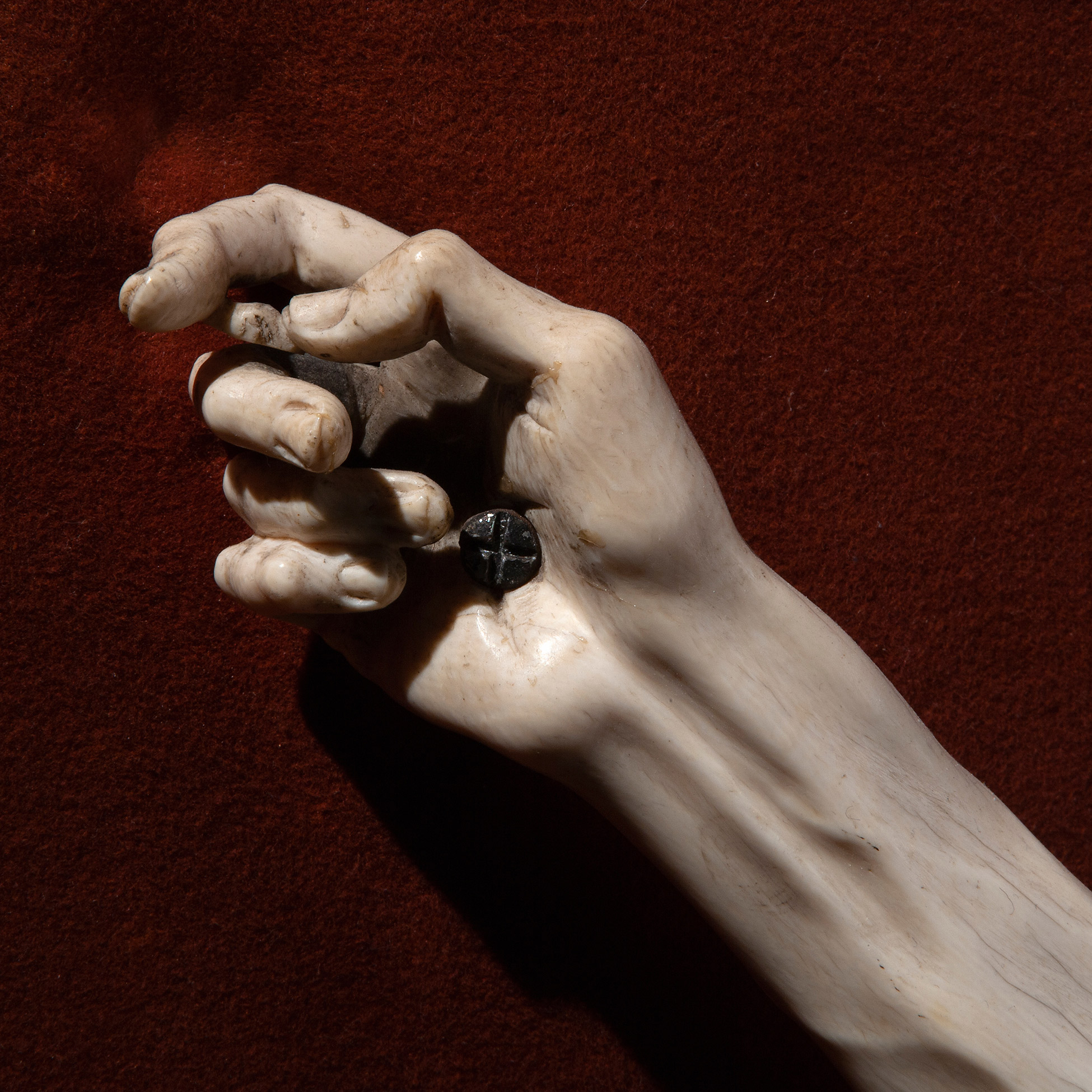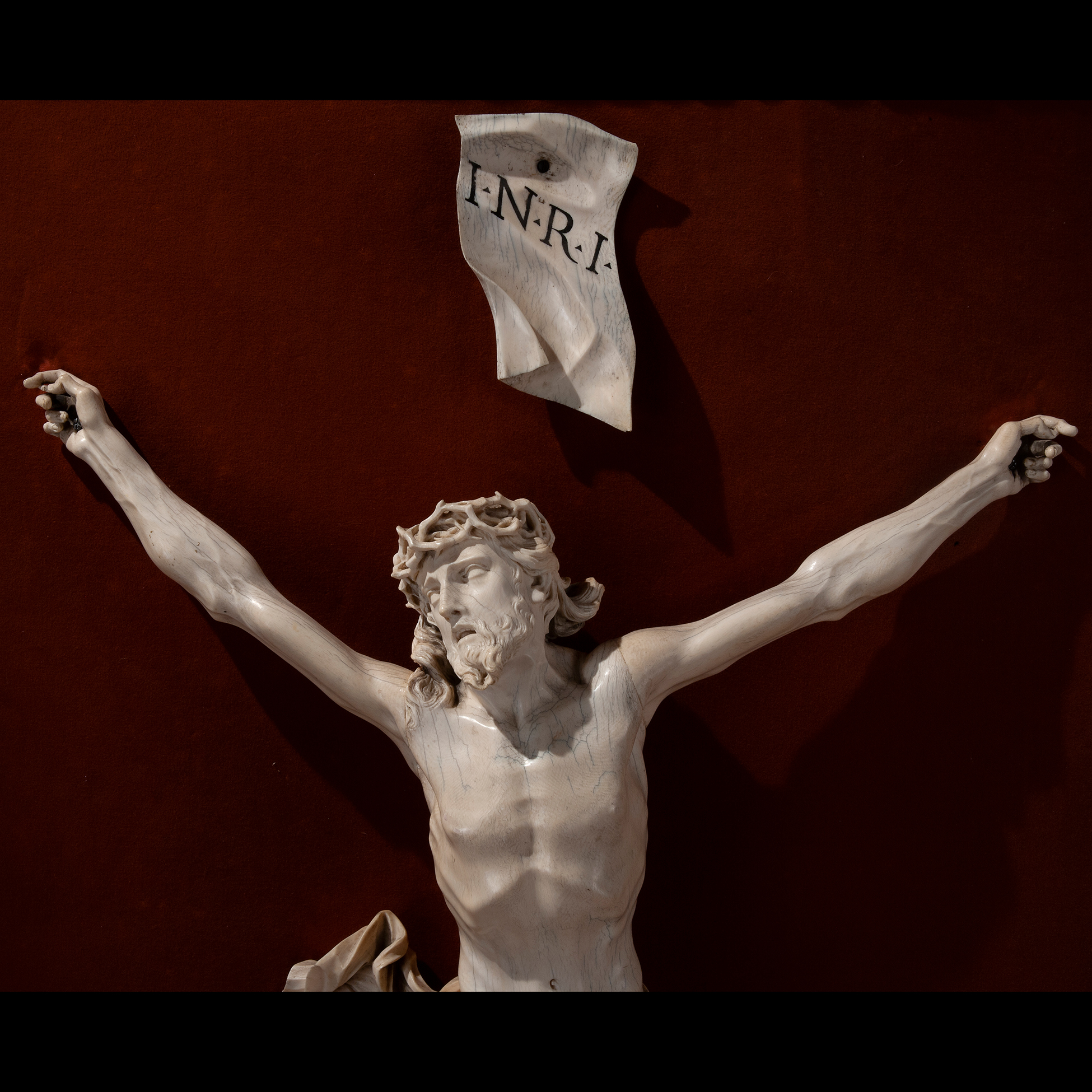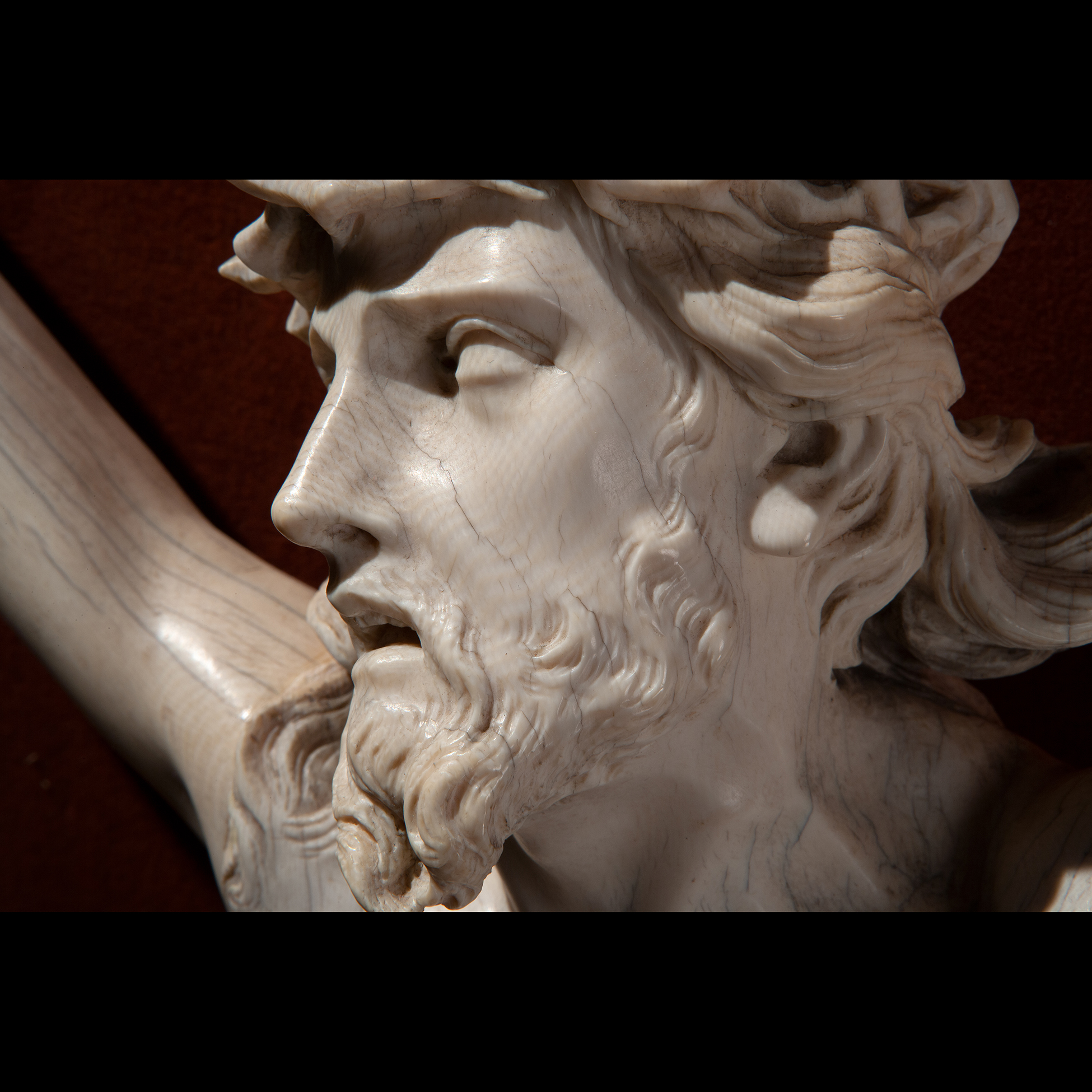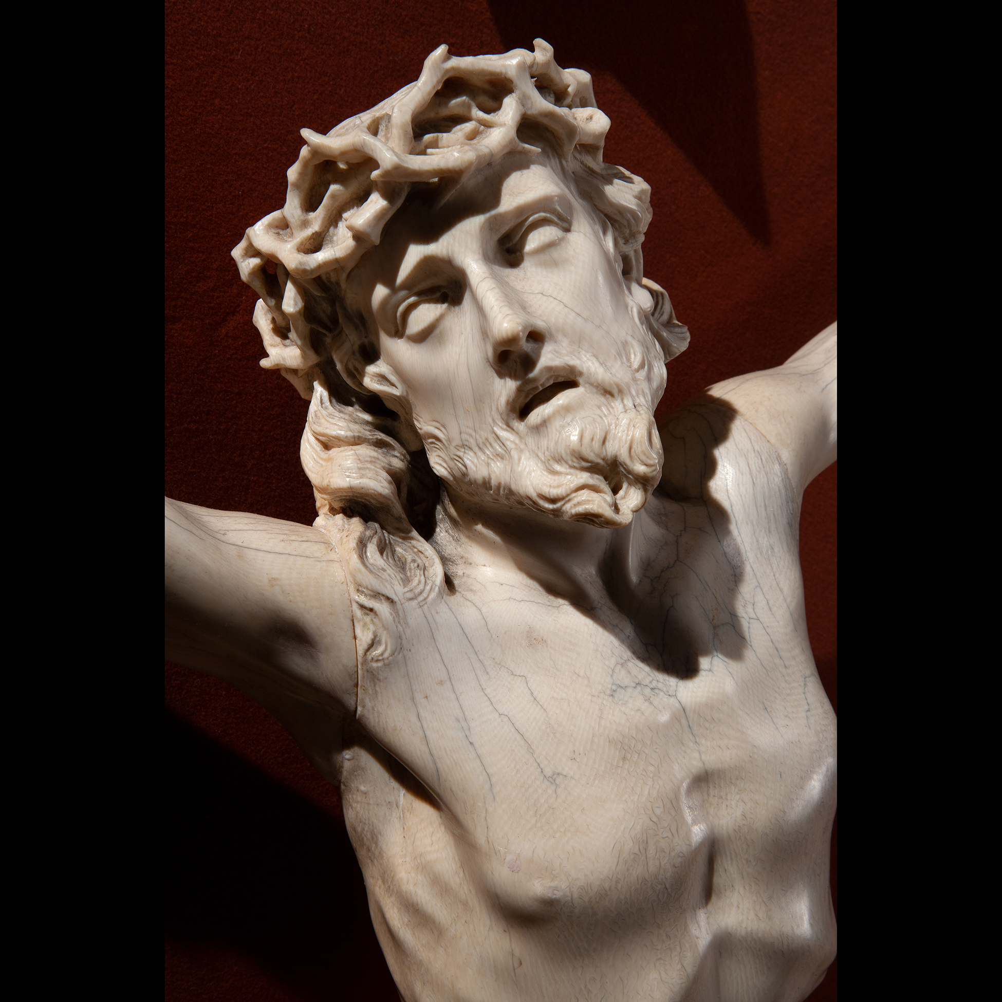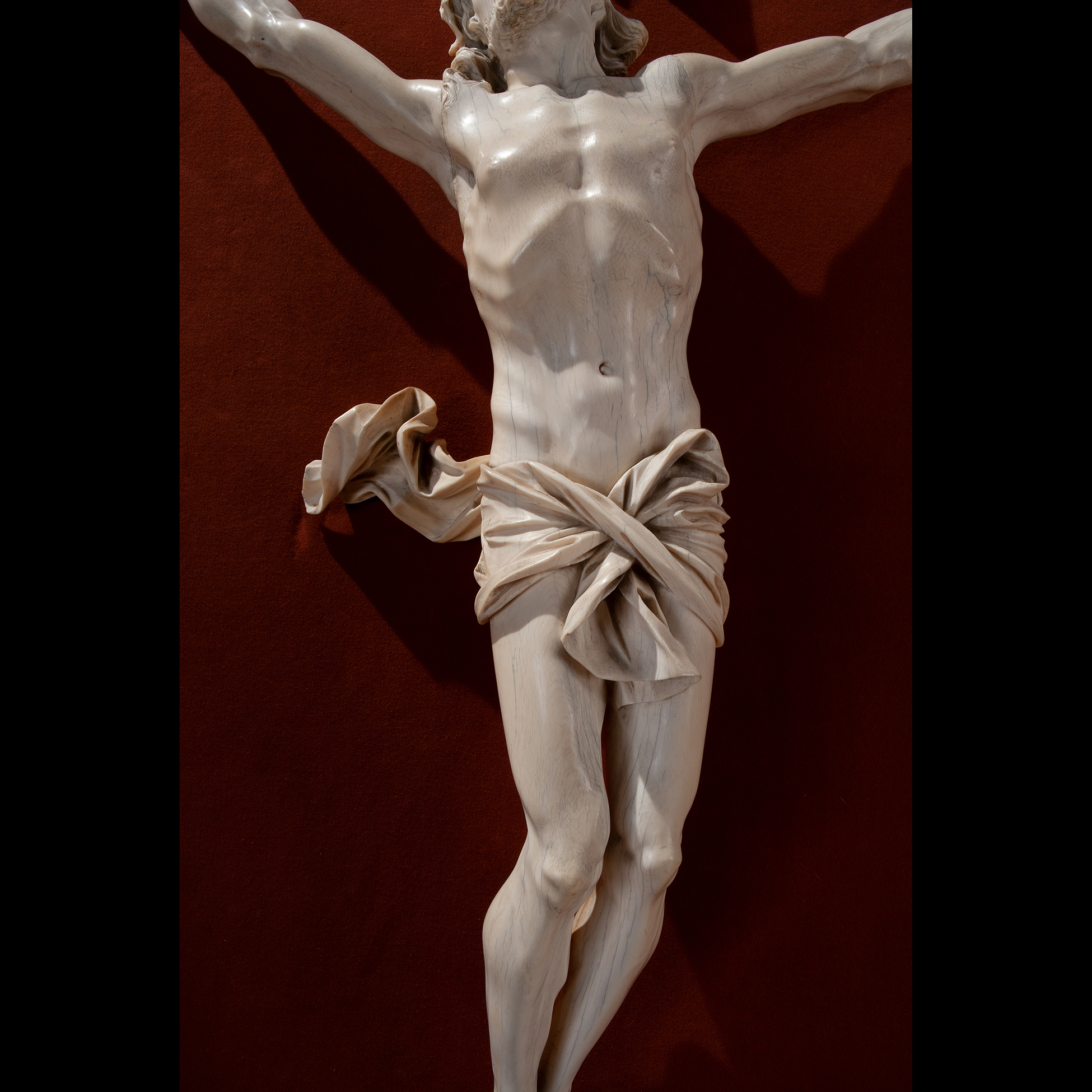 Cristo in avorio, Italia XIX secolo Scultura dotata di importante cornice dorata. Dimensioni 150x110x12 cm.