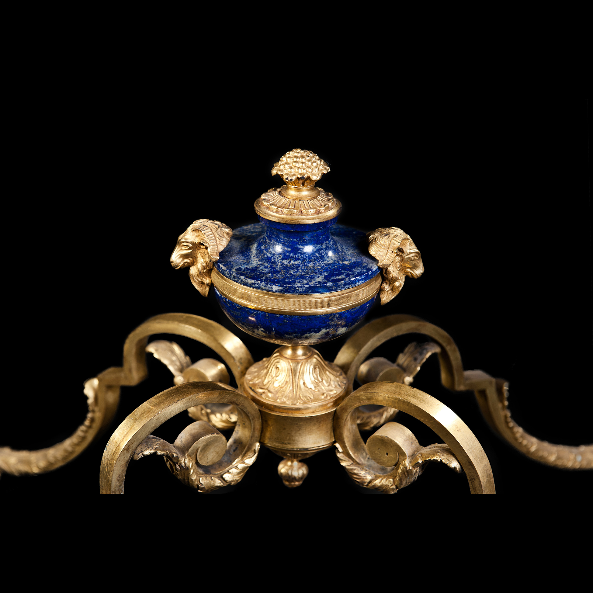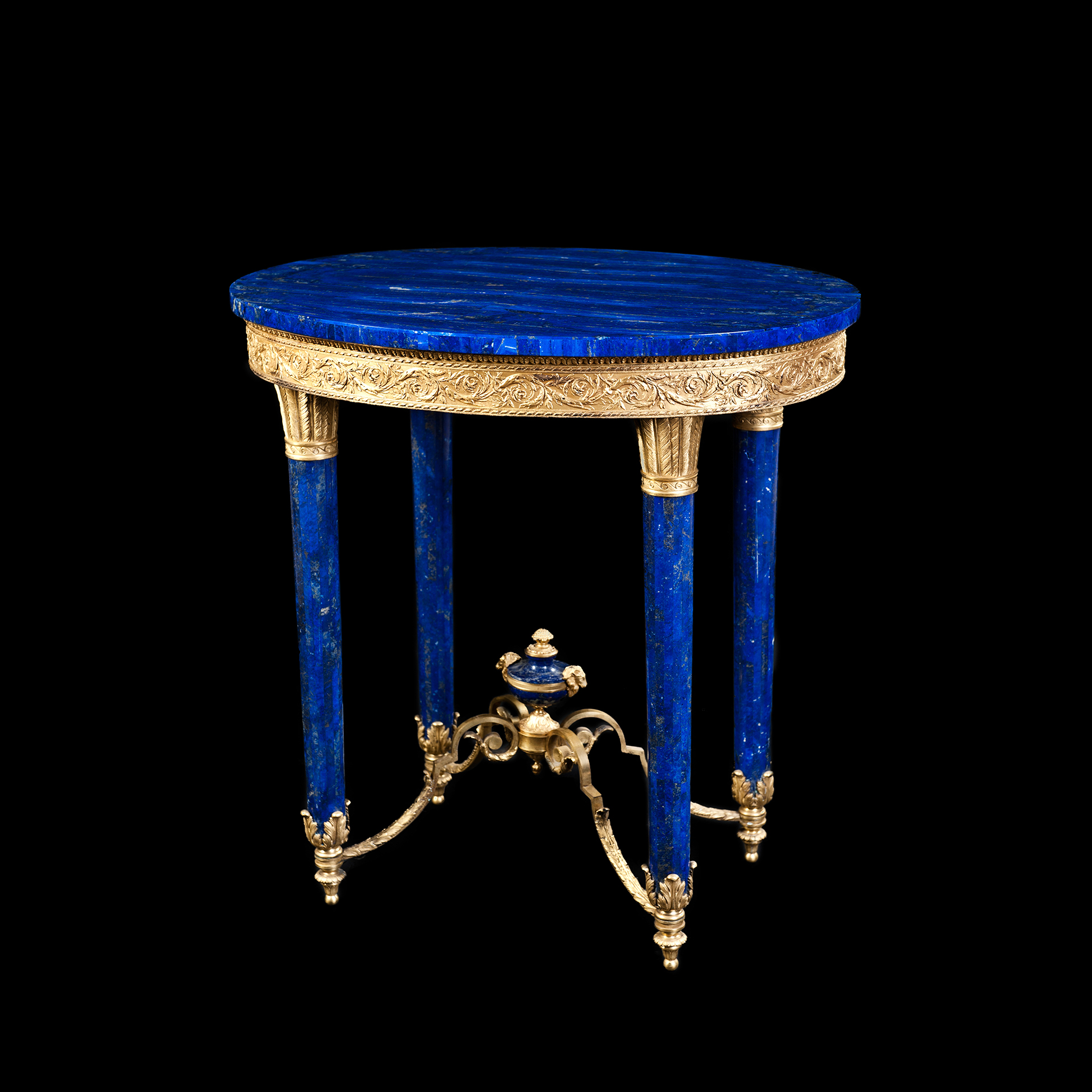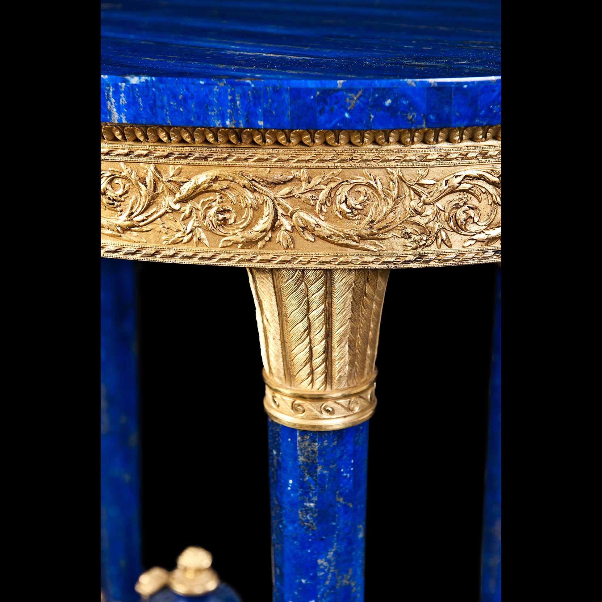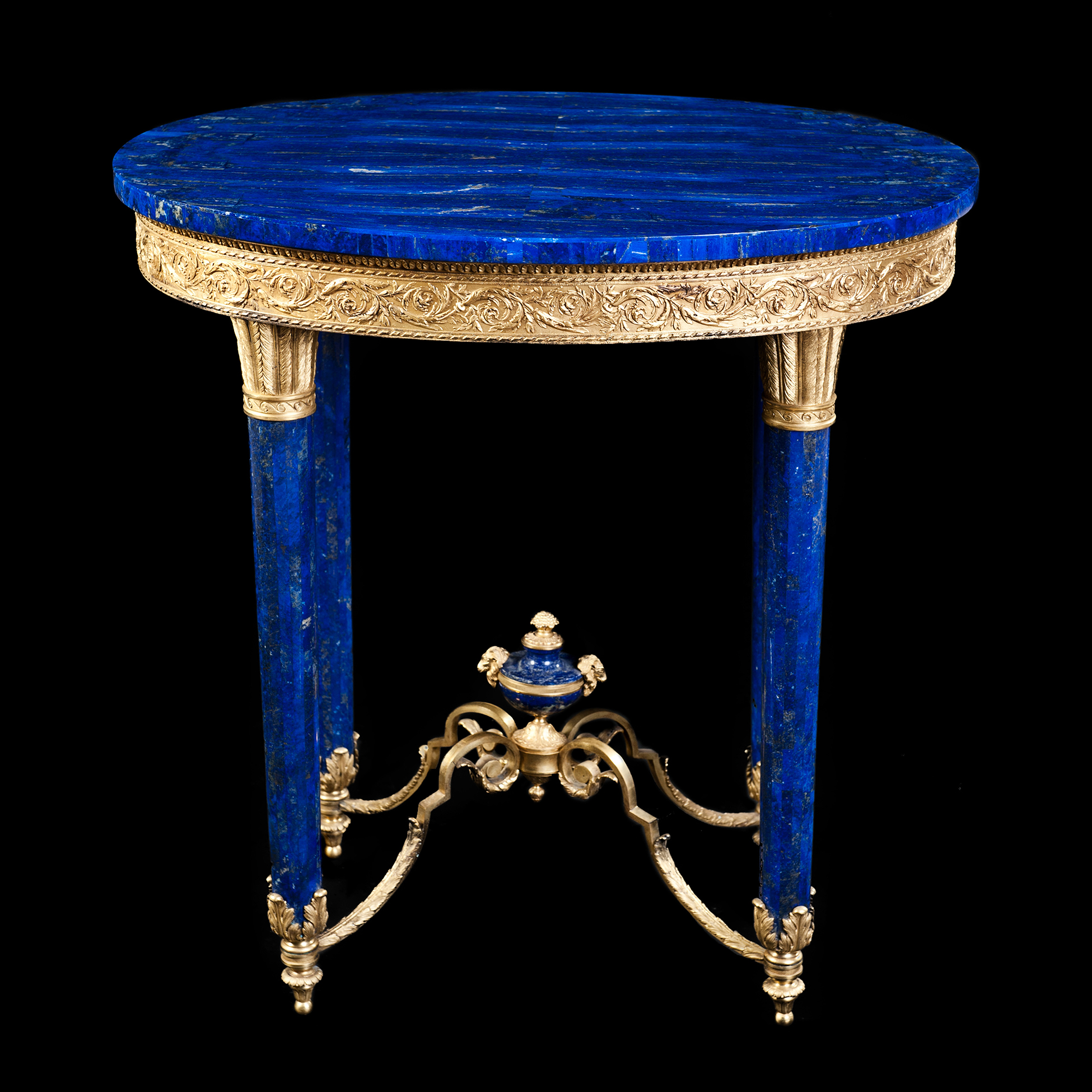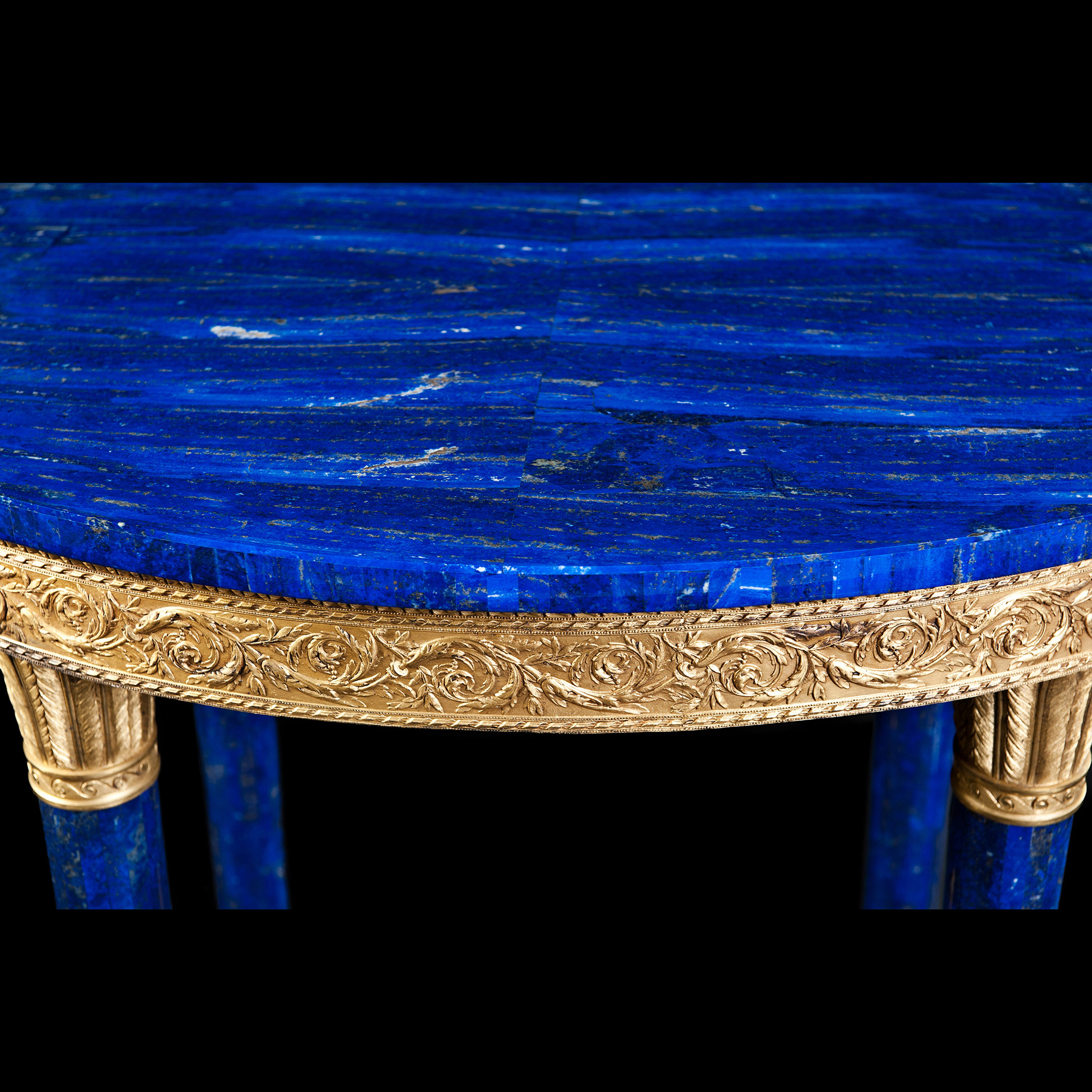 Eccezionale tavolo in lapislazzuli degli Urali, Russia XIX secolo Il ripiano tondo e le quattro gambe del tavolo sono interamente decorati in lapislazzuli, il bordo e i piedi del tavolo sono decorati a motivi vegetali in bronzo dorato. Dimensioni 77x7