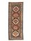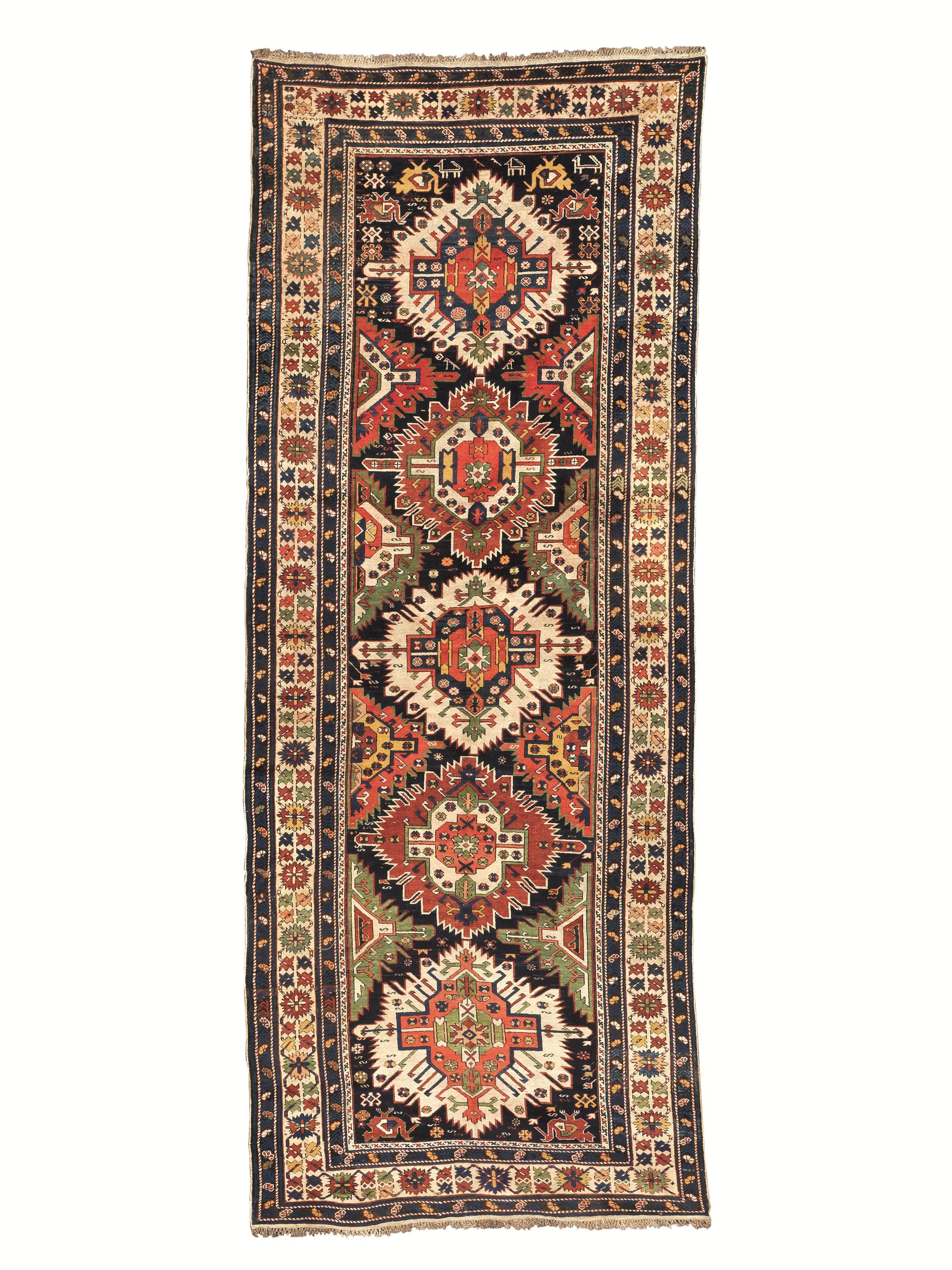 Tappeto caucasico Scirvan Zeiwa, sec. XIX, a fondo blu con cinque medaglione a "raggiera" avorio e rosso mattone, ai lati decori a cuspide verdi e rossi, bordura avorio con motivi a granchio, cm 390x150