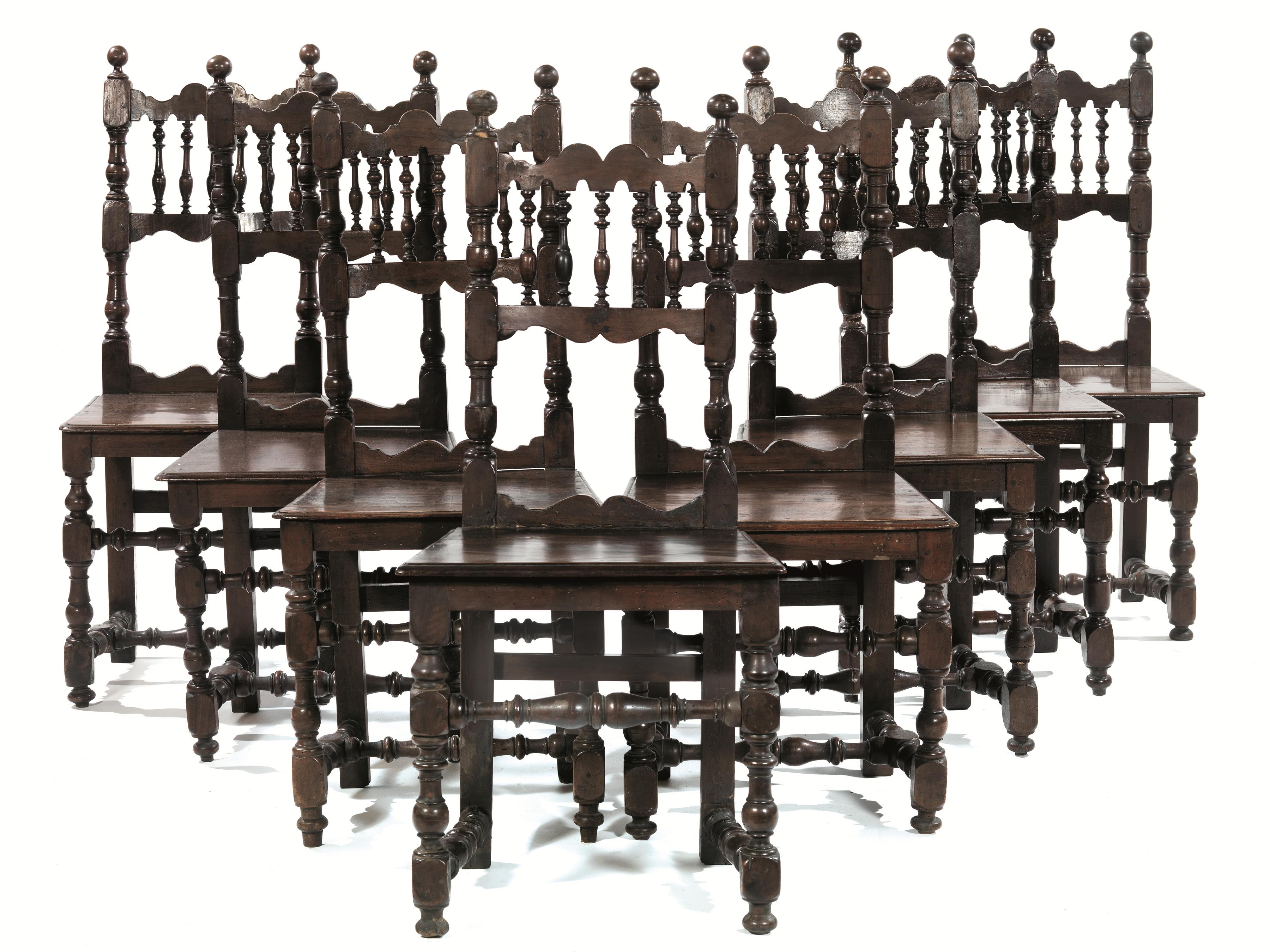 Otto sedie, Siena, inizi sec. XVIII, in noce intagliato a patina scura, spalliera sagomata con cartella traforata a birilli, gambe tornite riunite da traversa ad H, simili tra loro, alcuni restauri (8)