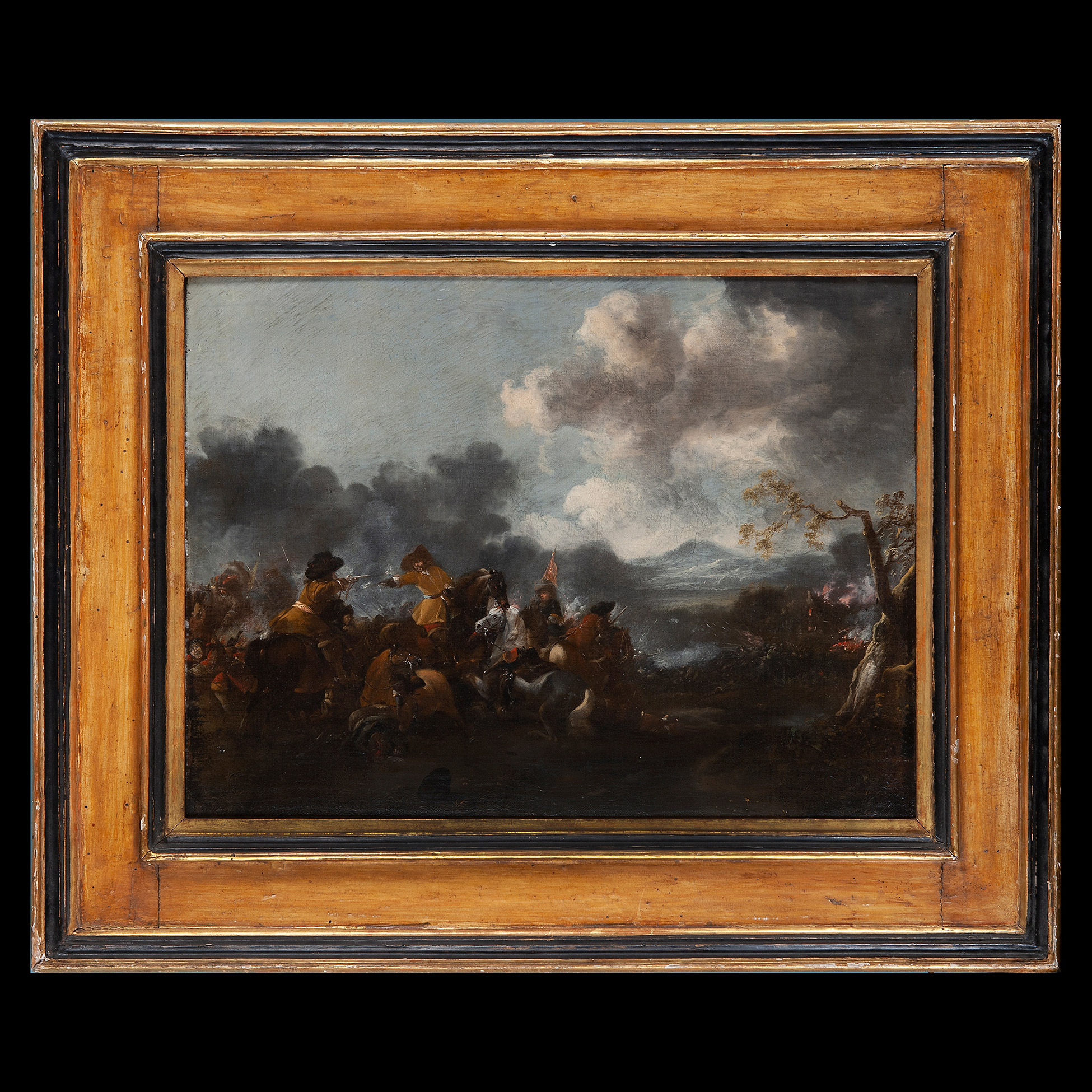 Jacques Courtois, detto il Borgognone (Saint-Hyppolite 1621 - Roma 1676), ambito di, Scena di battaglia L'anonimo artista è di certo stato influenzato dal pittore francese nella sua produzione di battaglie 'a volo d'uccello'. Il Borgognone ebbe un viva