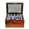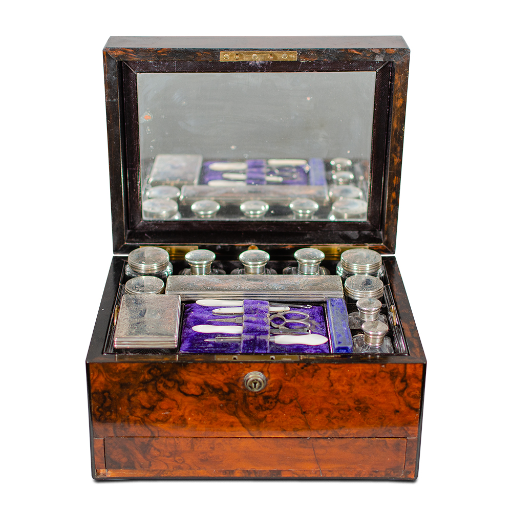 bauletto in legno completo di boccette in vetro e accessori con impugnatura in madreperla, cm 18x30,5x22,5. Difetti.